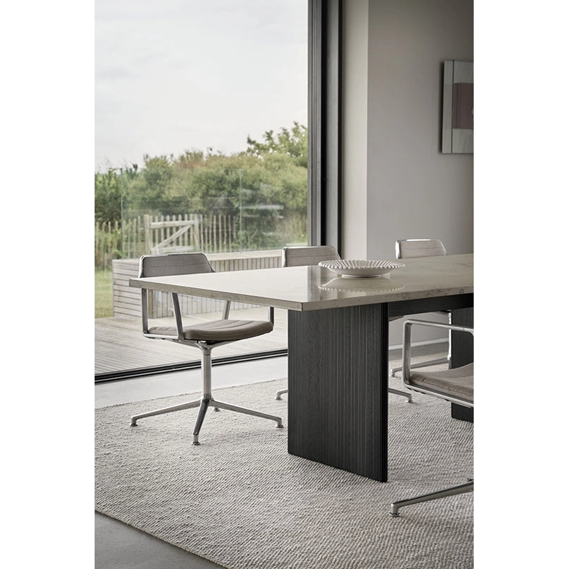 The Swivel+ office chair from Vipp combines comfort, ergonomics and refined design, making it an ideal choice for workspaces and meeting rooms. The chair from bureau with Swivel glides offers an extra-upholstered seat, extended backrest and adjustable height, ensuring optimum comfort for extended periods of sitting. Its slim armrests blend harmoniously with the discreet, upholstered backrest, giving the armchair a light appearance despite its robust construction. Mounted on a five-legged base in polished or powder-coated aluminium, the Swivel Chair office chair is fitted with a choice of castors or skids, offering 360° rotation. The chair is available in aniline leather or top-of-the-range textile, selected by Vipp for its quality and elegance. The fabrics are made from 55% linen, 35% wool and 10% polyamide, while the aniline leather, treated without chromium, retains natural markings that reinforce its unique character. To ensure healthy posture and extra comfort, the Swivel+ features a tilt mechanism that automatically adjusts to the user's movements. Every detail has been designed to ensure a long-lasting, functional experience. Published by Vipp, this office chairwithskids timeless design adapts to your preferences with bespoke upholstery options, available on request, to fit perfectly into your workspace.