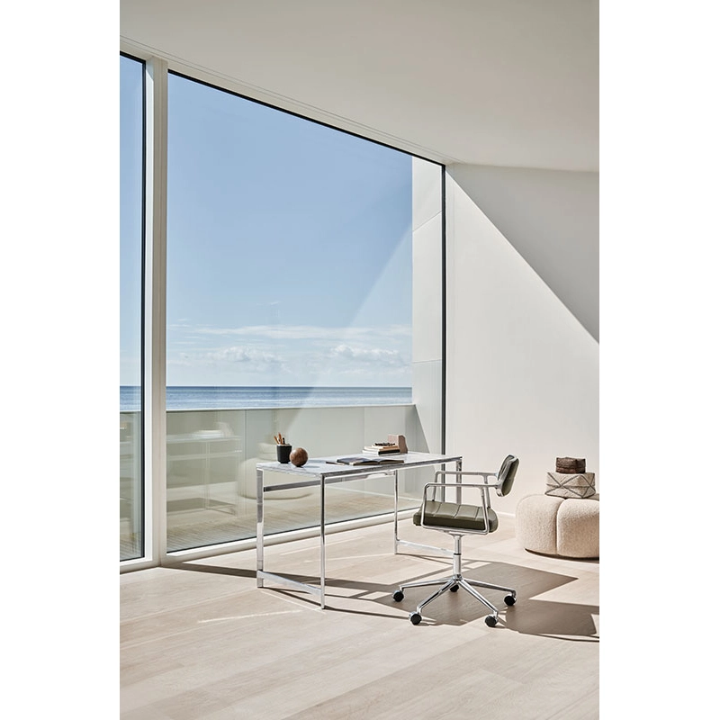 The Swivel+ office chair from Vipp combines comfort, ergonomics and refined design, making it an ideal choice for workspaces and meeting rooms. An evolution of the original Swivel model, this chair from office with castors offers an extra-upholstered seat, extended backrest and adjustable height, ensuring optimum comfort for extended periods of sitting. Its slim armrests blend harmoniously with the discreet, upholstered backrest, giving the armchair a light appearance despite its robust construction. Mounted on a five-legged base in polished or powder-coated aluminium, the Swivel Chair office chair is fitted with a choice of wheels or glides, offering 360° rotation. The chair is available in aniline leather or top-of-the-range textile, selected by Vipp for its quality and elegance. The fabrics are made from 55% linen, 35% wool and 10% polyamide, while the aniline leather, treated without chromium, retains natural markings that reinforce its unique character. To ensure healthy posture and extra comfort, the Swivel+ features a tilt mechanism that automatically adjusts to the user's movements. Every detail has been designed to ensure a long-lasting, functional experience. Published by Vipp, this armchairdesk with a timeless design adapts to your preferences thanks to bespoke upholstery options, available on request, to fit in perfectly with your workspace.