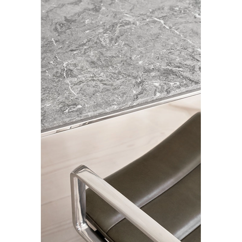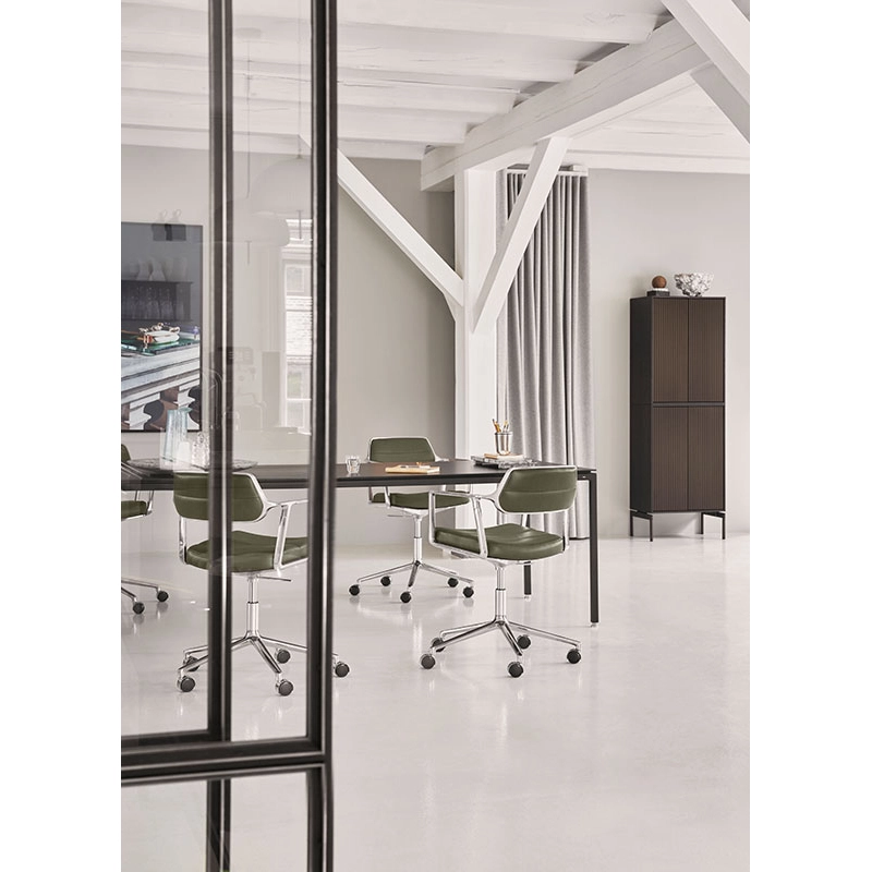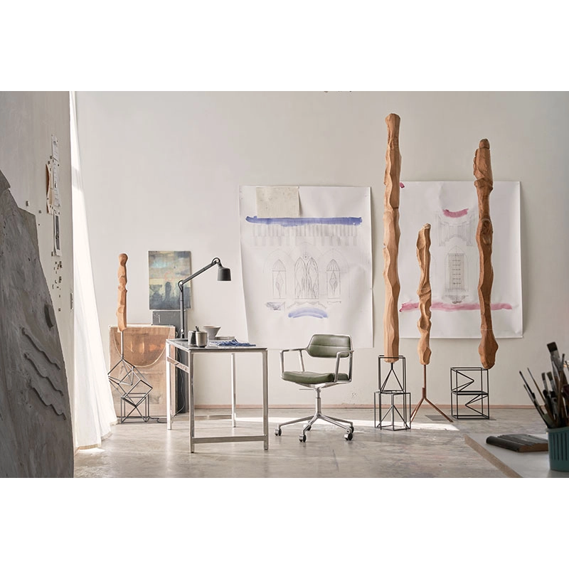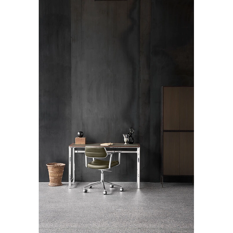 The Swivel+ office chair from Vipp combines comfort, ergonomics and refined design, making it an ideal choice for workspaces and meeting rooms. An evolution of the original Swivel model, this chair from office with castors offers an extra-upholstered seat, extended backrest and adjustable height, ensuring optimum comfort for extended periods of sitting. Its slim armrests blend harmoniously with the discreet, upholstered backrest, giving the armchair a light appearance despite its robust construction. Mounted on a five-legged base in polished or powder-coated aluminium, the Swivel Chair office chair is fitted with a choice of wheels or glides, offering 360° rotation. The chair is available in aniline leather or top-of-the-range textile, selected by Vipp for its quality and elegance. The fabrics are made from 55% linen, 35% wool and 10% polyamide, while the aniline leather, treated without chromium, retains natural markings that reinforce its unique character. To ensure healthy posture and extra comfort, the Swivel+ features a tilt mechanism that automatically adjusts to the user's movements. Every detail has been designed to ensure a long-lasting, functional experience. Published by Vipp, this armchairdesk with a timeless design adapts to your preferences thanks to bespoke upholstery options, available on request, to fit in perfectly with your workspace.