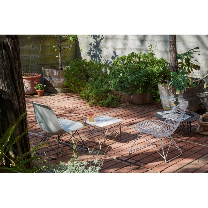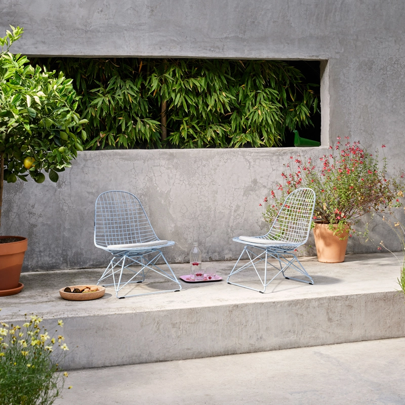 Designed by Charles and Ray Eames from welded steel wire, the Wire Chair combines transparent lightness with technological sophistication. Edited by Vitra, the Wire Chair is now available with a new lounge height base: the Eames Wire Chair LKR (Lounge Height K-Shell R-Wire Base).  The LKR armchairs have an epoxy or chrome finish. Models with a powder-coated finish are suitable for indoor and outdoor use. Perfect for the garden or living room, The LKR armchair is available in the same finishes as the DKR chair, including the spring colours offered by Vitra, based on the palette designed by Charles & Ray Eames: Lemon, Sky Blue, Dark Green and Eames Seafoam Green.
