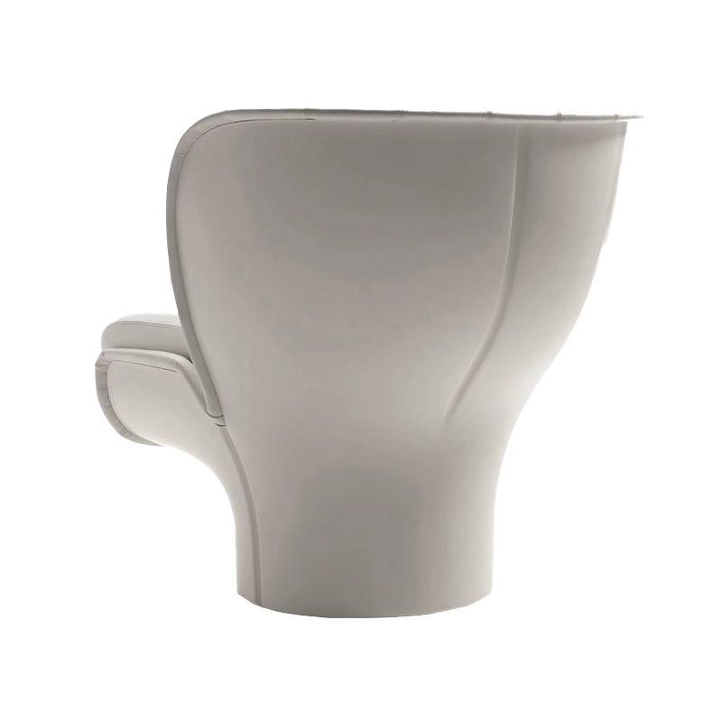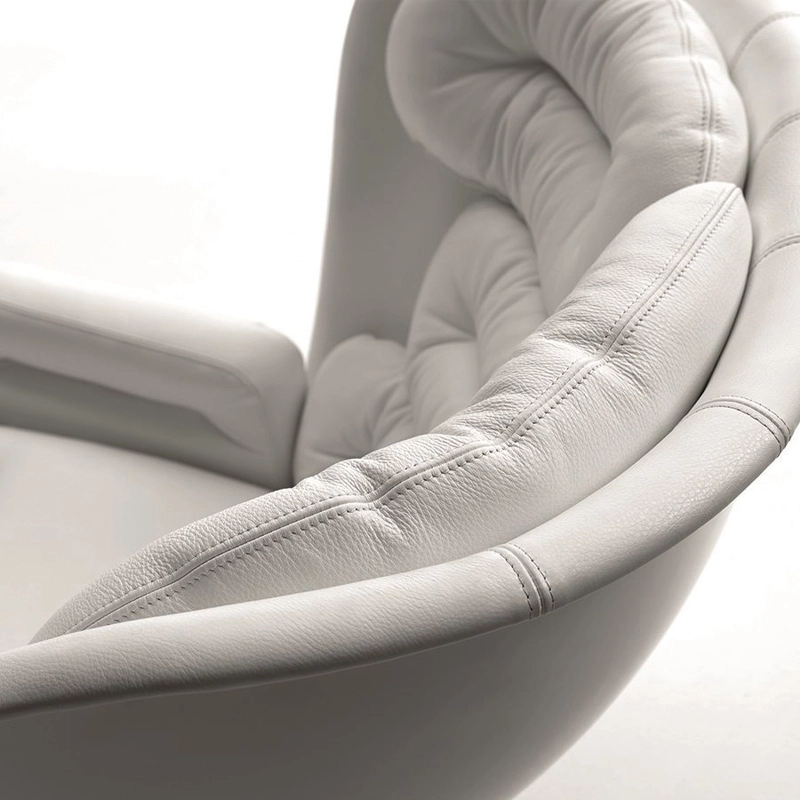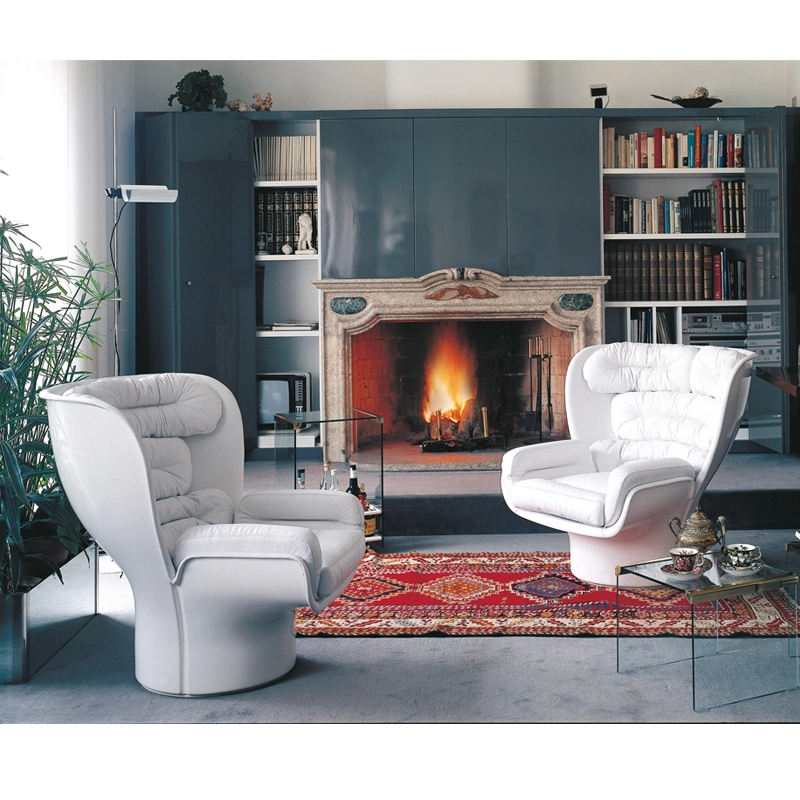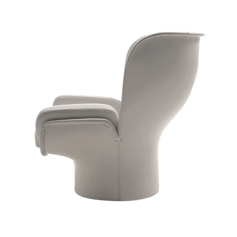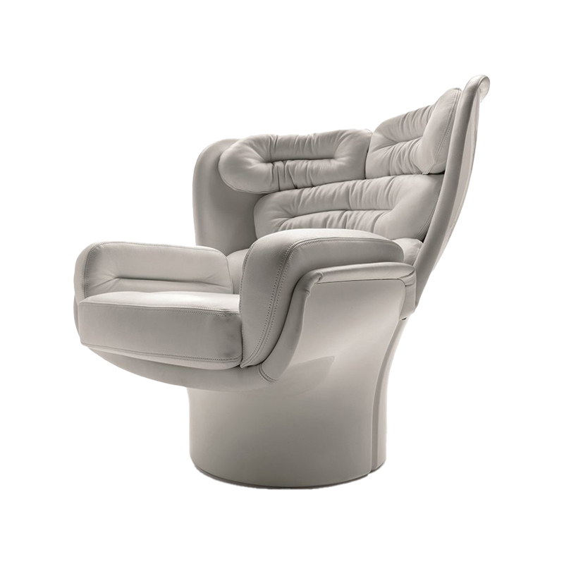 The structure of the Elda armchair, looking futuristic for a 60s/70s observer, features a rotating circular base connected to two petal-shaped fibreglass caps on which hang tubular, removable leather-covered cushions. The comfort provided by the Elda armchair is guaranteed by the height and cocoon formed by its backrest made from a lightweight yet hard-wearing composite material. Initially produced in a white leather finish, Colombo has also designed a model of the armchair in which the cushions are wrapped in black leather.