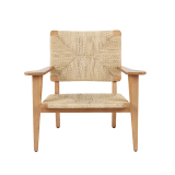 A little-known piece by Marcel Gascoin, the F-Chair made its first appearance in 1949 at the "Maison Rurale" travelling exhibition, showcasing furniture adapted to the needs of country life. However, the F-Chair was never produced on a large scale and the original editions have now become rare items. This lounge chair is based on the famous C-Chair, with elements such as the tapered back legs. Other elements have been modified to create a lounge chair: the more relaxed recline of the chair and the paddle-shaped armrests, as well as the woven seat that widens at the front.