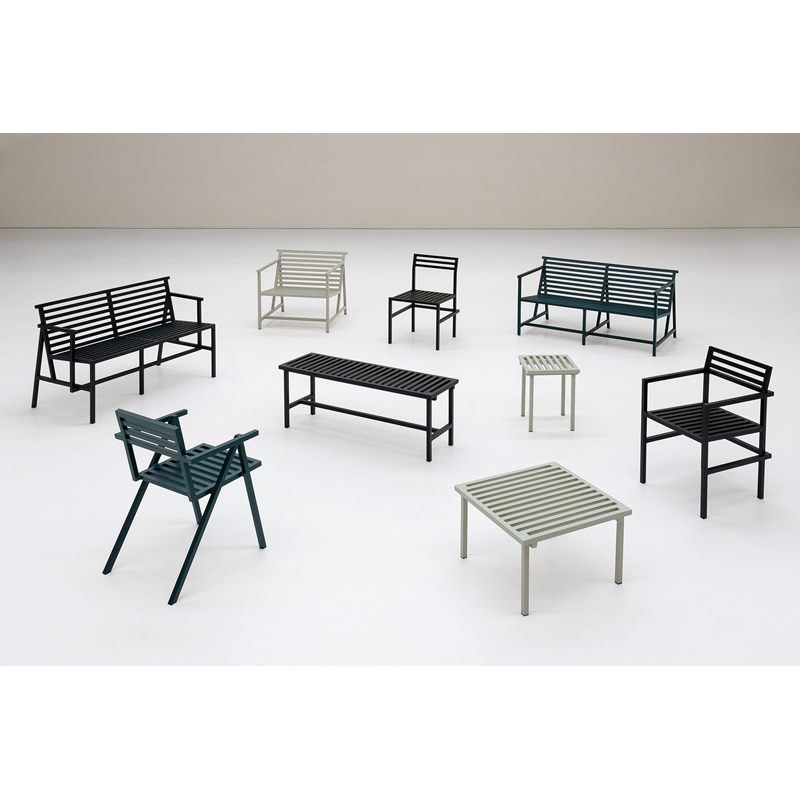 19 Outdoors is a collection of outdoor furniture inspired by the Butterfield Brothers 19 Chairs charity project. Published by the Nine brand, All the pieces in the collection have a unique design, but are unified by the material, colours and proportions of the aluminium extrusions that define the family. All the furniture in the 19 Outdoors collection therefore works very well together, and the colours on offer are a perfect match. The 19 Outdoors range includes chairs, benches, an armchair, a stool, a footrest and dining tables. All of these pieces are equally suited to use in domestic and communal environments, from a small balcony to a restaurant terrace.