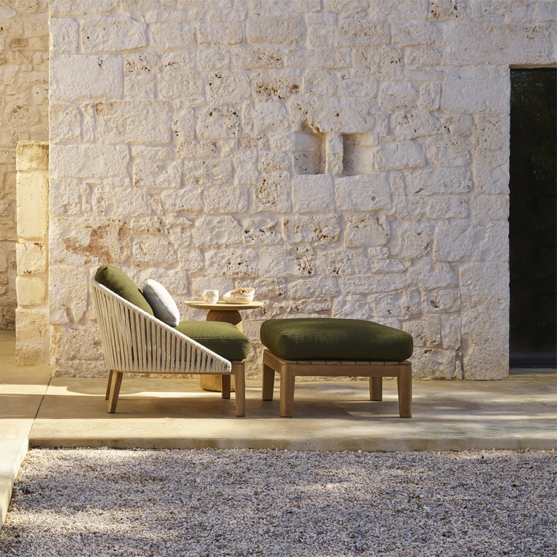 The airy design of the Mood collection, and the combination of warm teak with the skilful hand-weaving of the backrests immediately create an intimate atmosphere on your terrace. The silhouette of the durable teak base gives the collection a soft, welcoming look. The weave of the Mood lounge armchair is handmade from Tricord, an eco-friendly fibre (polyolefin) that is very soft to the touch and weather-resistant. Tribu has created the Mood collection in a range of natural shades that allow it to blend into any outdoor environment. The comfort of the Mood lounge chair is enhanced by thick, plush outdoor cushions, designed for staying outdoors all season long.