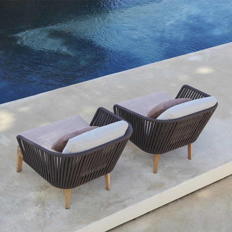 The airy design of the Mood collection, and the combination of warm teak with the skilful hand-weaving of the backrests immediately create an intimate atmosphere on your terrace. The silhouette of the durable teak base gives the collection a soft, welcoming look. The weave of the Mood lounge armchair is handmade from Tricord, an eco-friendly fibre (polyolefin) that is very soft to the touch and weather-resistant. Tribu has created the Mood collection in a range of natural shades that allow it to blend into any outdoor environment. The comfort of the Mood lounge chair is enhanced by thick, plush outdoor cushions, designed for staying outdoors all season long.