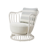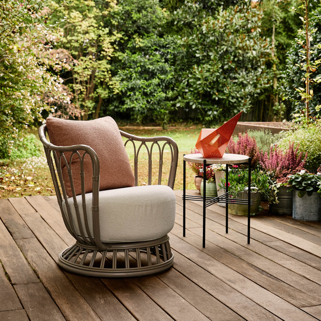 Inspired by Tove Kindt-Larsen’s 1936 sketch, the Grace Lounge Chair has become a standout in the GUBI Collection. The new outdoor edition brings its sculptural beauty and nature-inspired aesthetic into open-air spaces, with a modern upgrade in synthetic rattan crafted from powder coated aluminum and polyethylene fibers. Lightweight, durable, and versatile, the Grace Outdoor Lounge Chair transitions effortlessly between indoor and outdoor settings. Available in black, white, or gray base, it features a deep seat cushion upholstered in weather-resistant fabric for outdoor use.