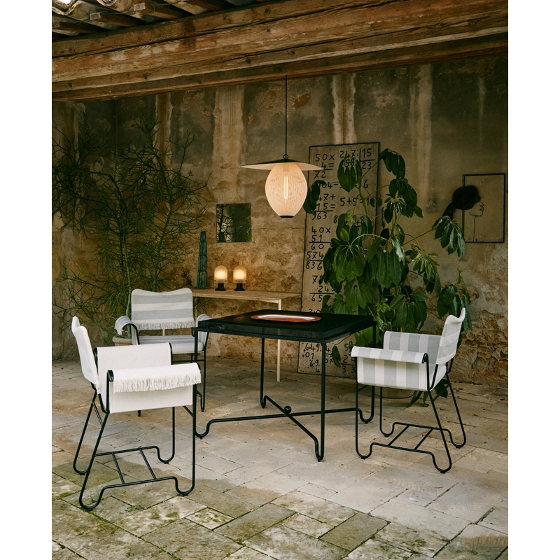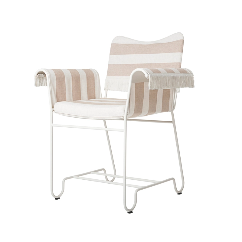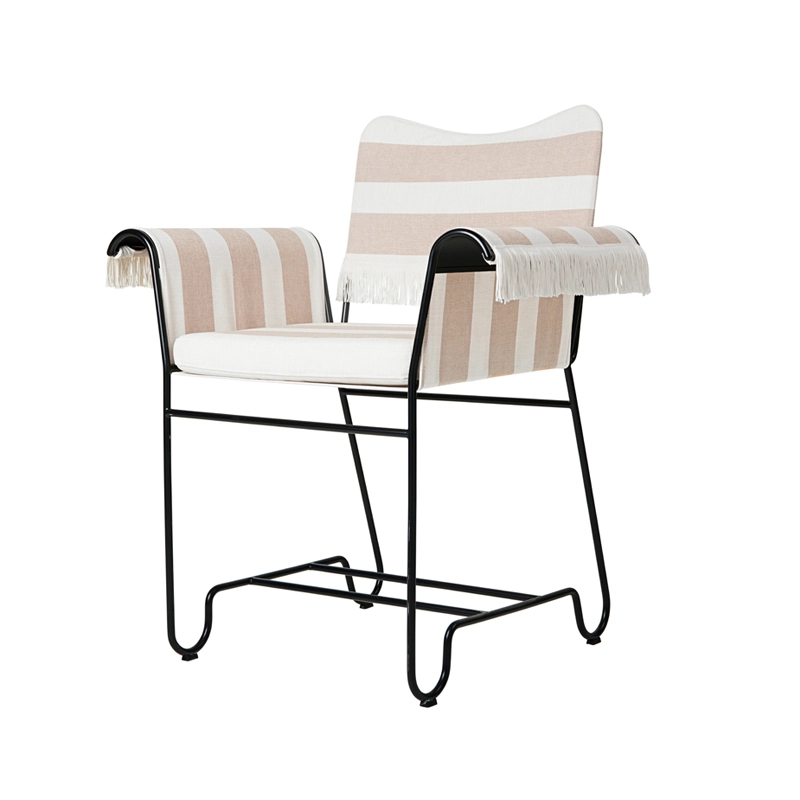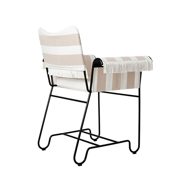 For the Tropique chairs, the seat and back are now made from a durable and flexible outdoor fabric. Suspended like a hammock from the frame, the seat is enveloping and easy to remove. The backrest is padded with foam and a separate cushion provides optimum comfort for the seat. The petit fauteuil Tropique is available with or without fringes on the armrests.