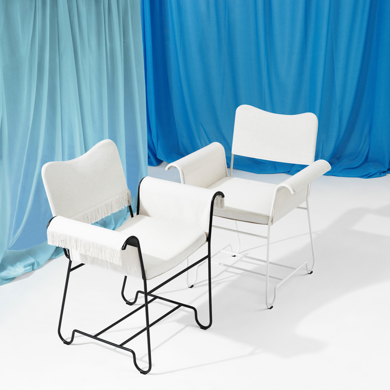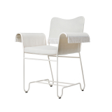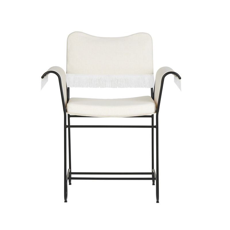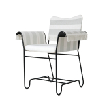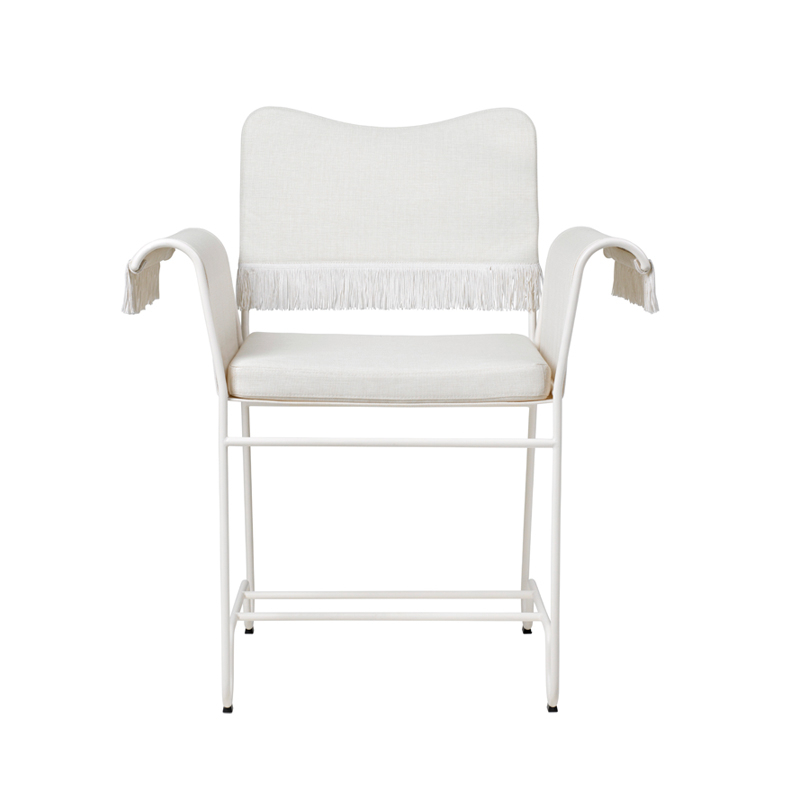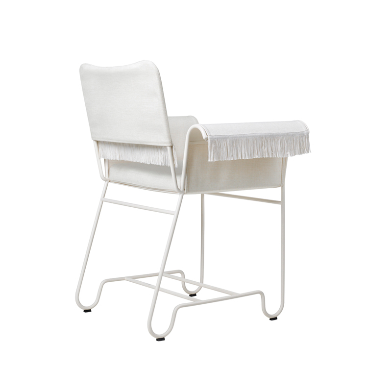 For the Tropique chairs, the seat and back are now made from a durable and flexible outdoor fabric. Suspended like a hammock from the frame, the seat is enveloping and easy to remove. The backrest is padded with foam and a separate cushion provides optimum comfort for the seat. The petit fauteuil Tropique is available with or without fringes on the armrests.