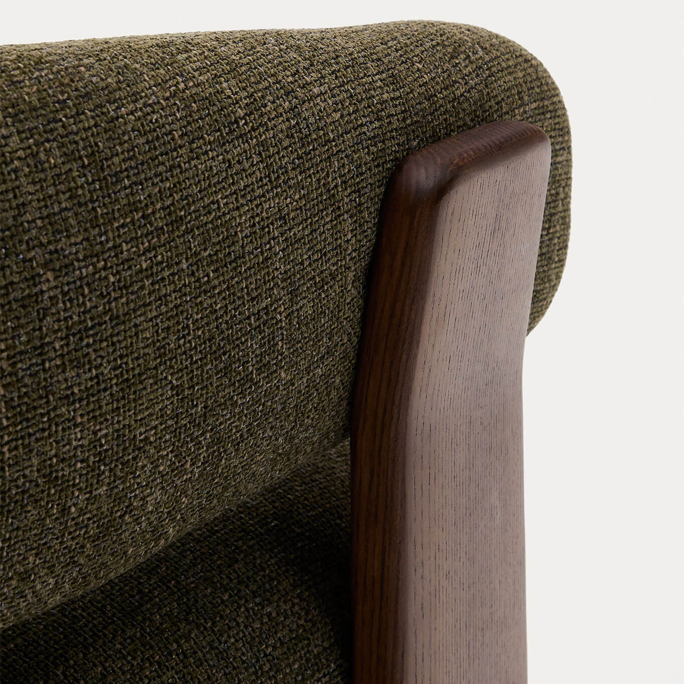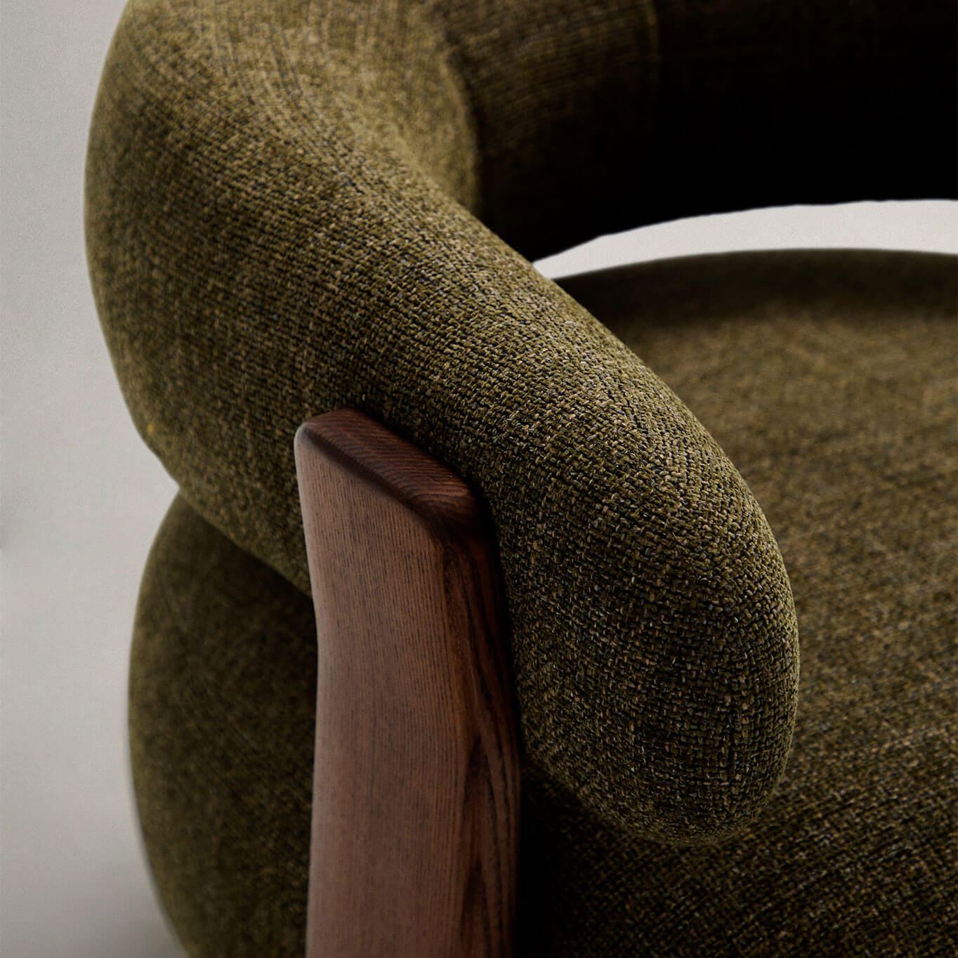 The Granite armchair by Kave Home is far more than just a seat, it's a statement piece, designed to combine style, comfort, and sustainability. With its bold presence, it adds a distinctive touch and personality to any living space. It embodies timeless elegance, inspired by 1970s Scandinavian design, featuring generous, enveloping, and sculptural forms. The wide seat and curved backrest are upholstered in a thick chenille fabric, soft and warm to the touch, offered in a subtly nuanced tone. This fabric is made from certified recycled polyester, complying with strict standards of durability and health safety. It is produced through an eco-friendly process aimed at reducing the environmental impact of textile manufacturing. The structure is supported by a solid ash wood base with a walnut finish, offering both stability and refined aesthetics. The wood used is FSC™ 100% certified, ensuring it comes from responsibly and sustainably managed forests. Every detail of the Granite armchair has been carefully crafted: balanced proportions, meticulous finishes, and a harmonious blend of natural materials and textured fabric. This armchair is part of a collection that pays tribute to craftsmanship and vintage design, reimagined with a modern twist. Whether placed in a living room, bedroom, or reading corner, the Granite armchair by Kave Home stands out as a unique creation, both functional and aesthetically refined, ideal for creating an elegant, welcoming, and character-filled space.