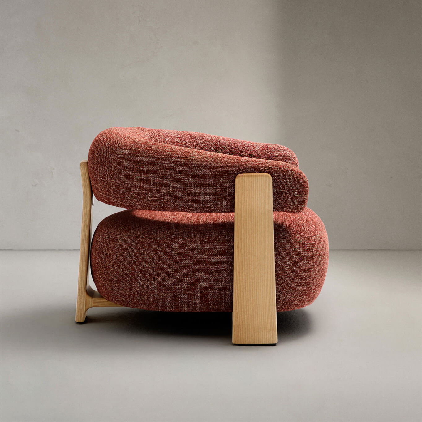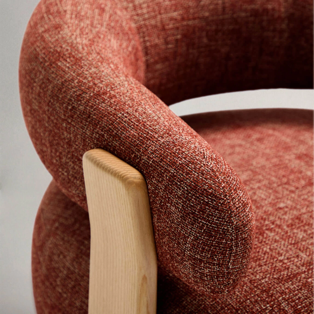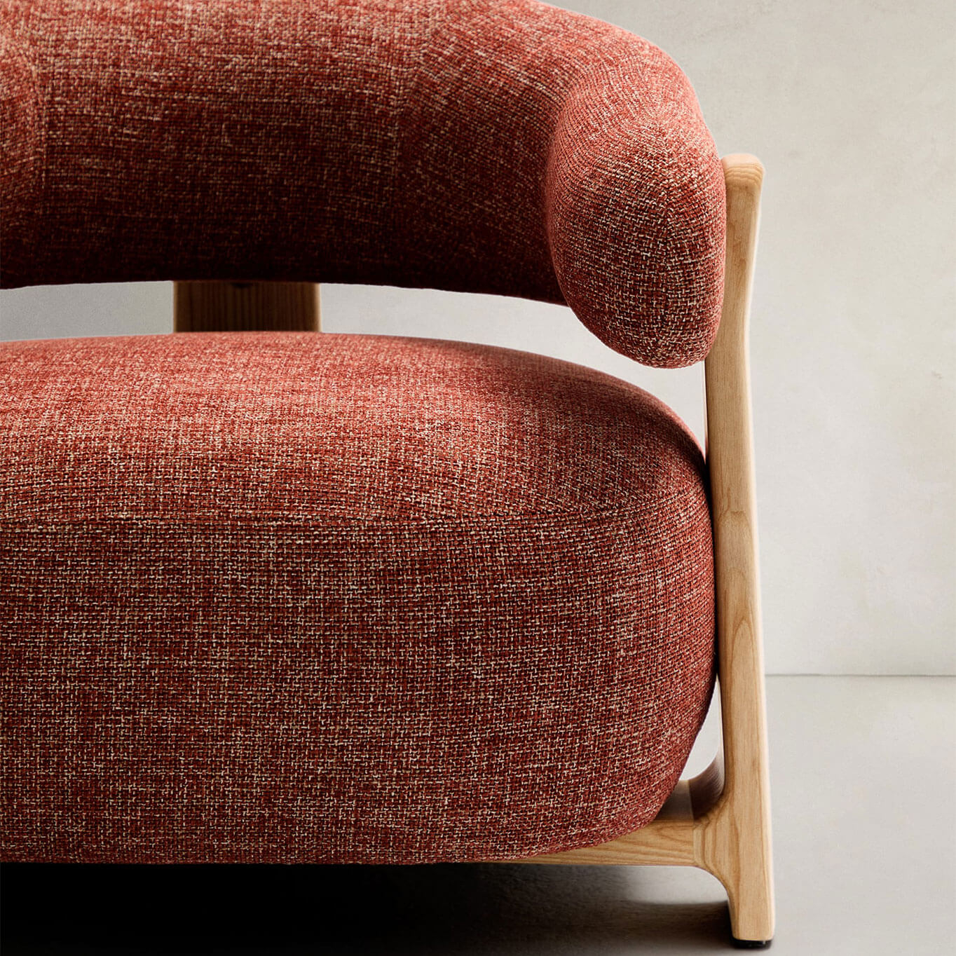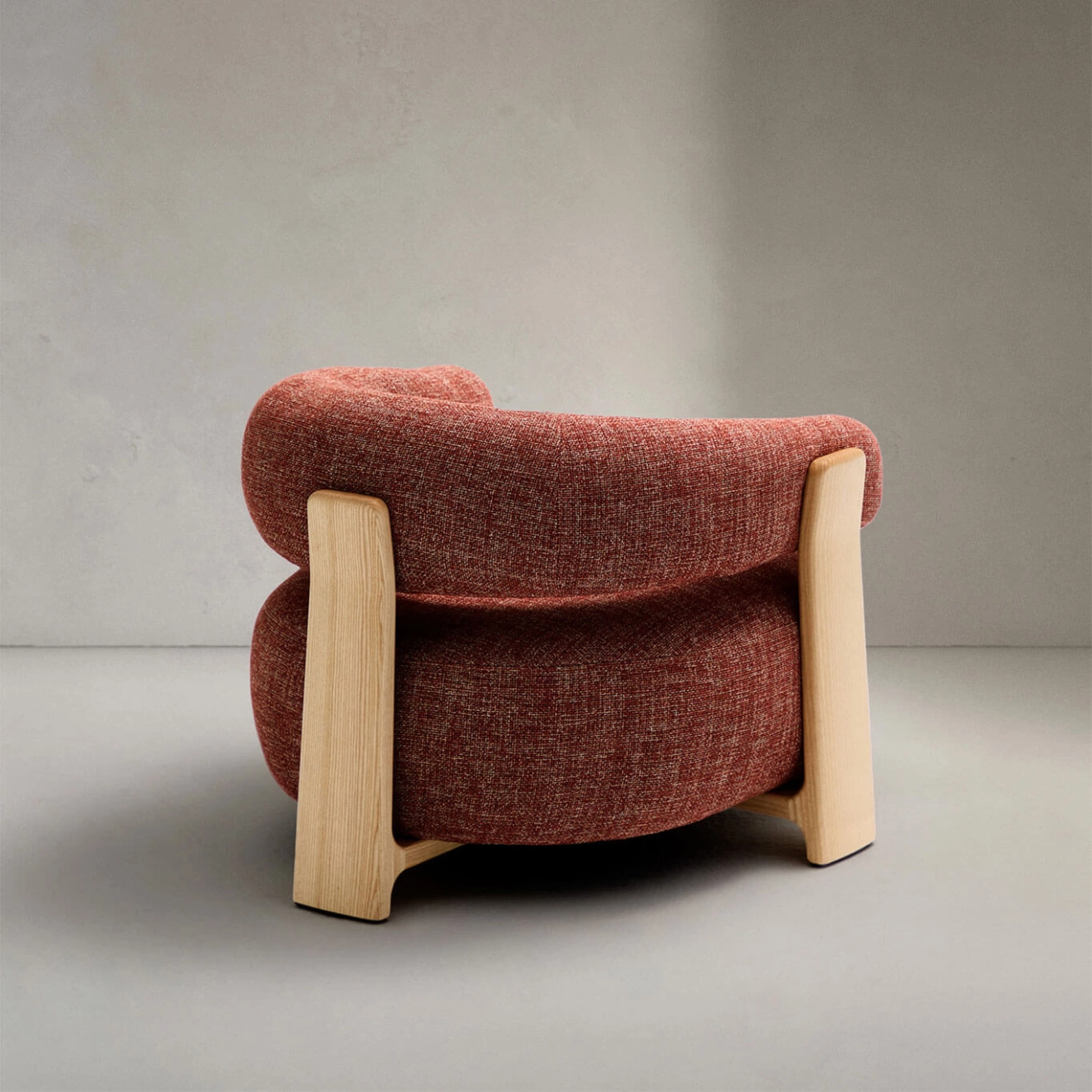 timeless elegance, inspired by 1970s Scandinavian design, featuring generous, enveloping, and sculptural forms. The wide seat and curved backrest are upholstered in a thick chenille fabric, soft and warm to the touch, offered in a subtly nuanced tone. This fabric is made from