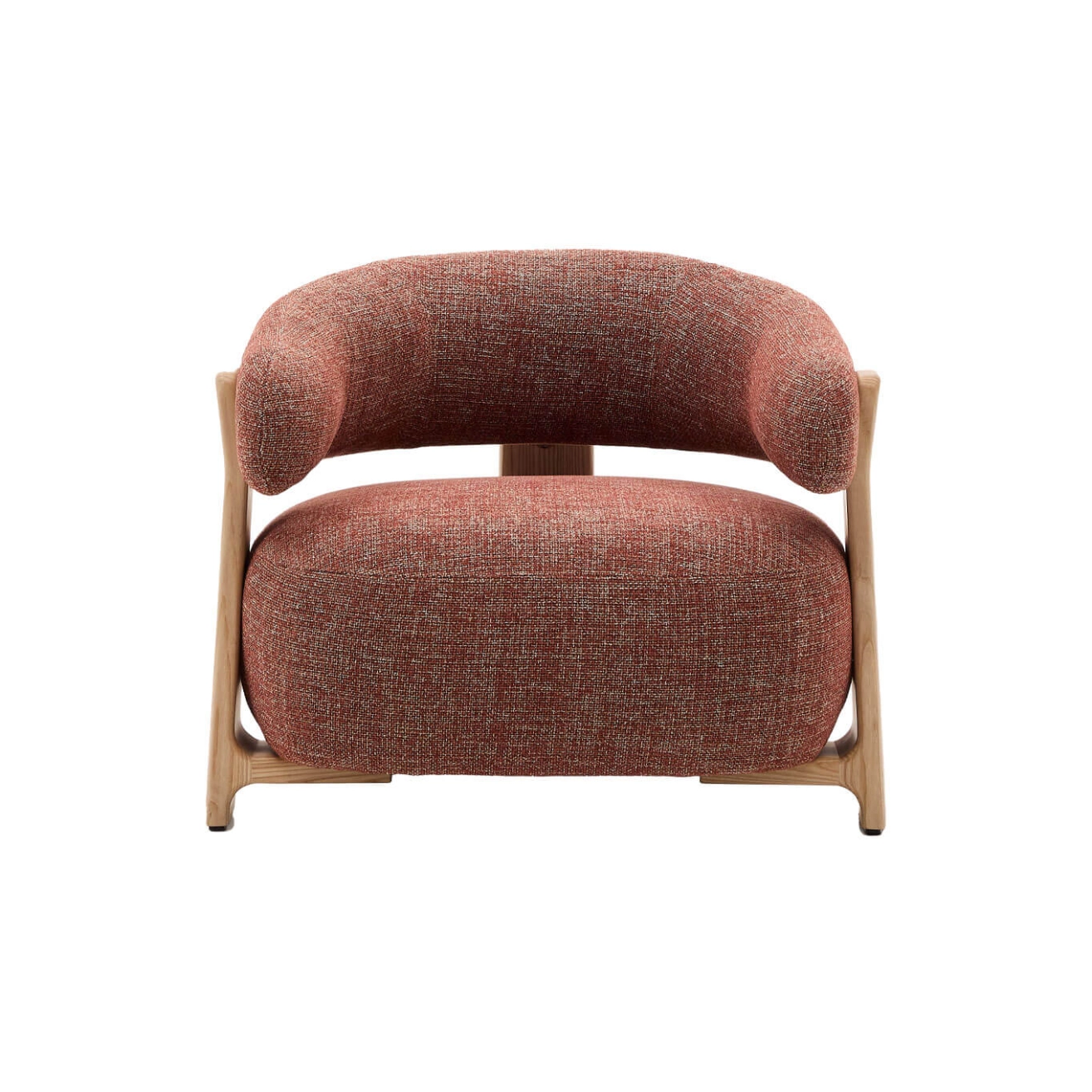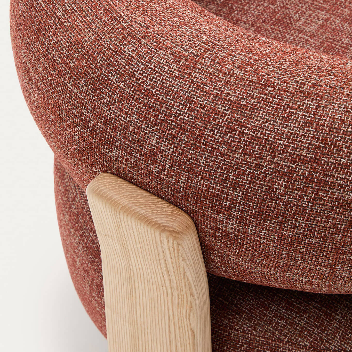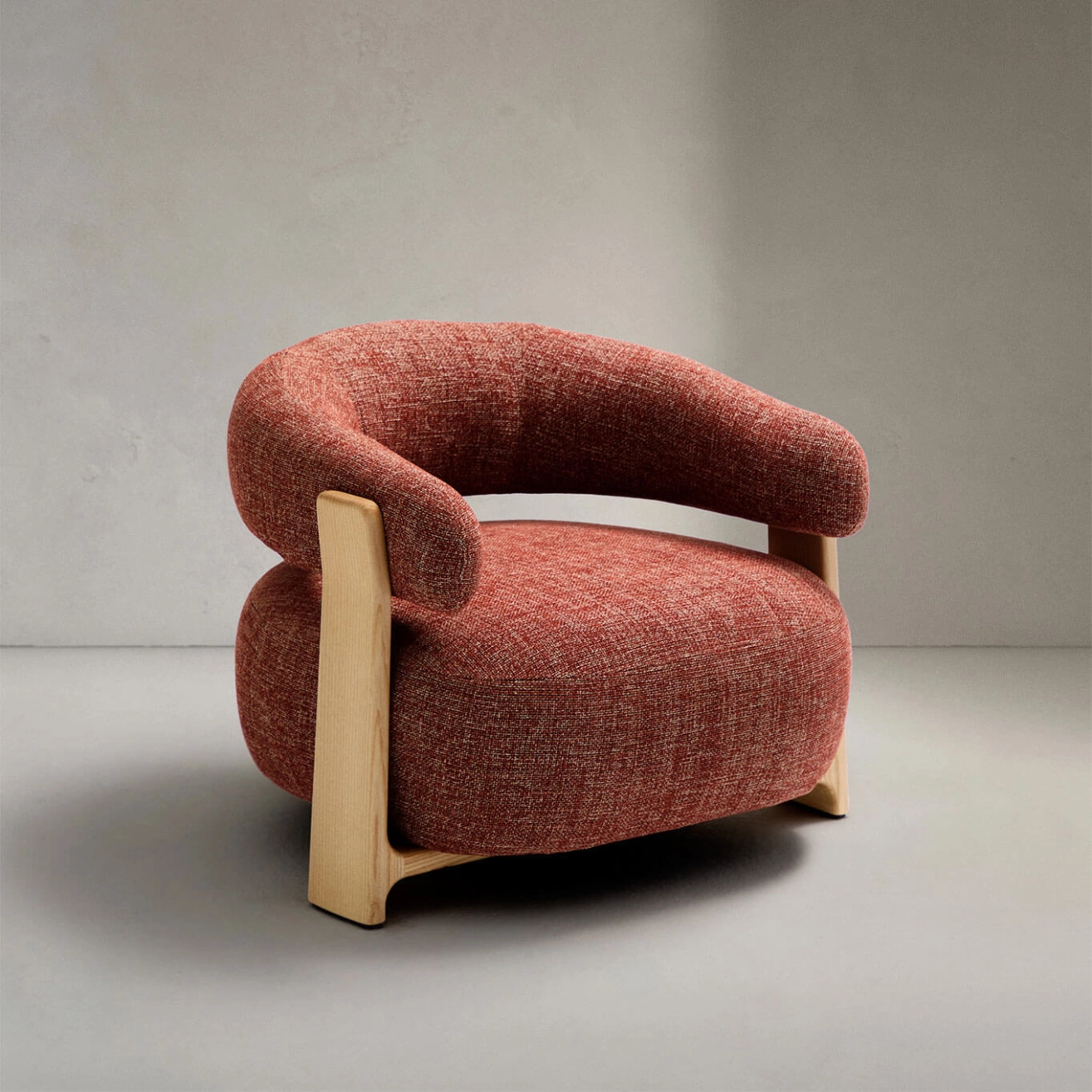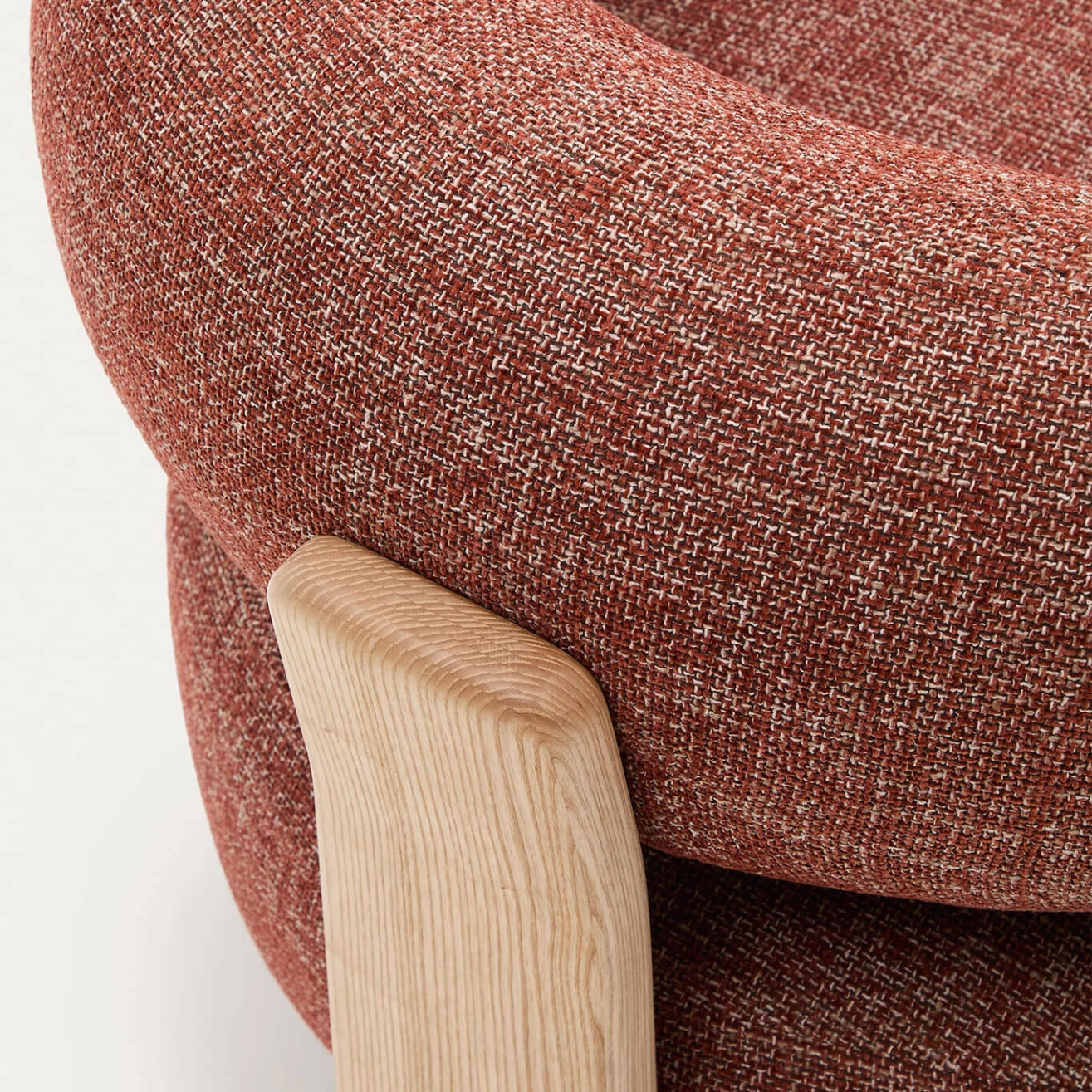 timeless elegance, inspired by 1970s Scandinavian design, featuring generous, enveloping, and sculptural forms. The wide seat and curved backrest are upholstered in a thick chenille fabric, soft and warm to the touch, offered in a subtly nuanced tone. This fabric is made from