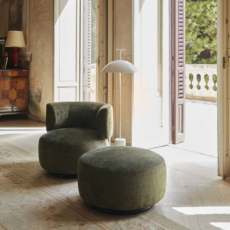 Designed by Rodolfo Dordoni for Kartell, K-Wait is a collection the upholstered seating collection that plays on the contrast between the formal simplicity of rigorous volumes and soft, rounded lines. The armchairs and sofas K-Wait are highly versatile and are equally suited to the home and communal spaces. The warm, elegant textile coverings add an extra touch of comfort.