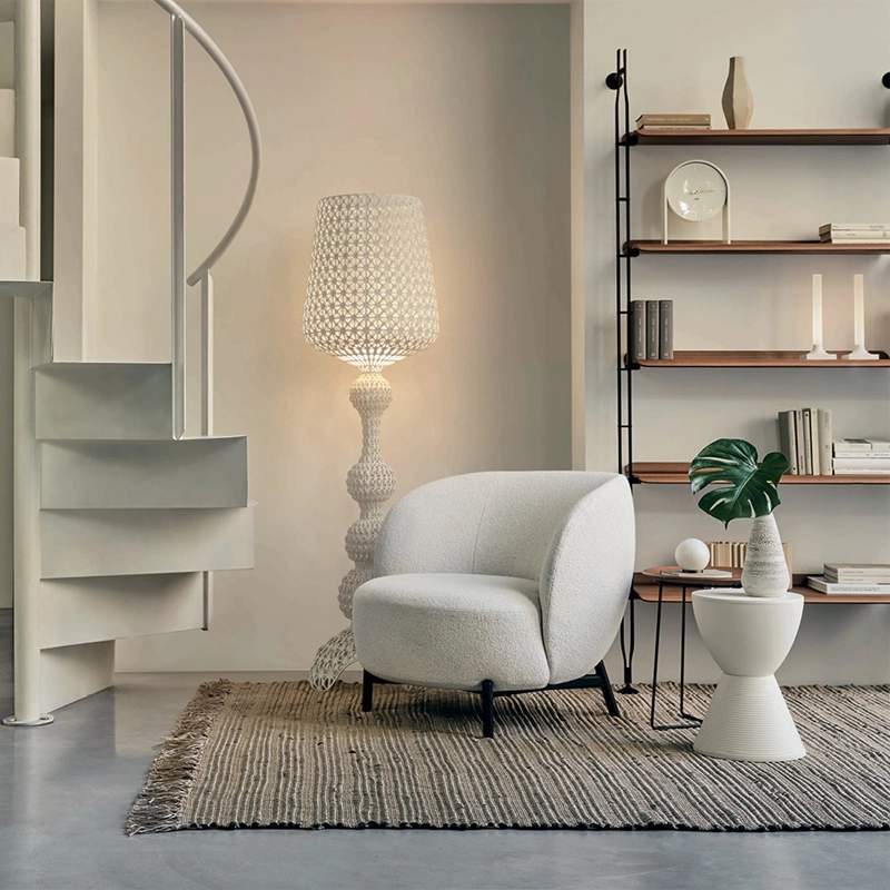With Lunam, Patricia has imagined a collection for the living room that recounts the dreamlike atmospheres of lunar landscapes. Each seat has an essential painted metal structure that supports the generous volumes of the upholstered seats. The sofa, armchair and footstool are available in soft bouclé fabric in a range of warm tones. Welcoming and enveloping, the Lunam Kartell armchair calls for relaxation. The covers in the Lunam collection are removable.