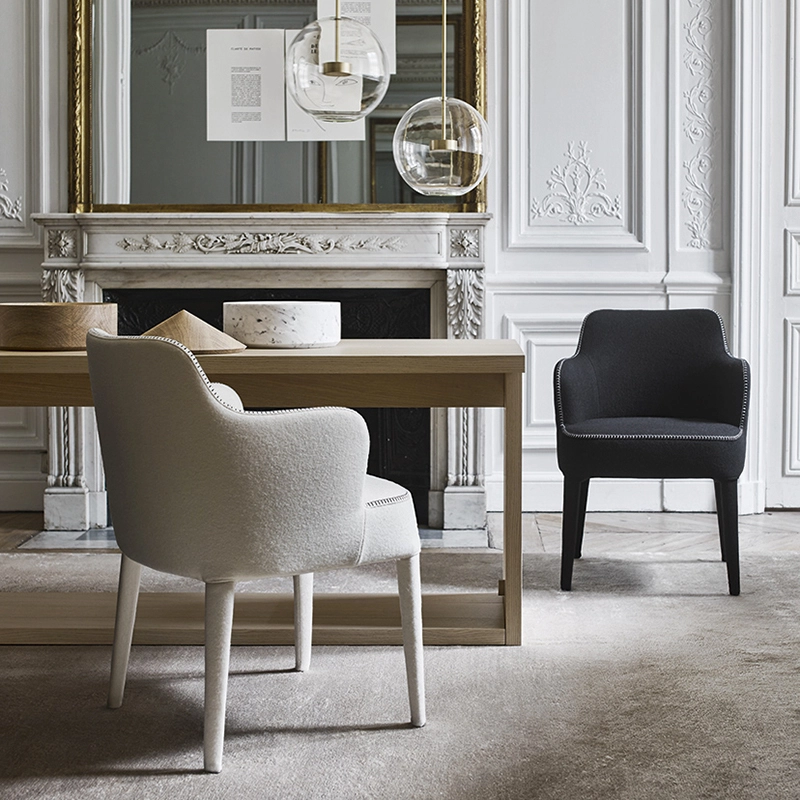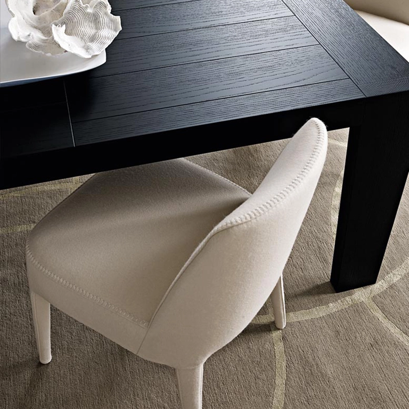 The Febo chair by Maxalto adds to an iconic collection, including sofas, armchairs, loungers and beds. It is available in three versions: the first with classic proportions and extreme comfort, the second with a 6 cm height, so that it can be placed next to the tea tables, and the final one with a high back and more enveloping lines. All Febo chairs are available with single-material upholstery, in fabric or leather with exposed rider stitching, combined with legs in grey oak, brushed light oak, brushed black oak or smoke-stained oak.