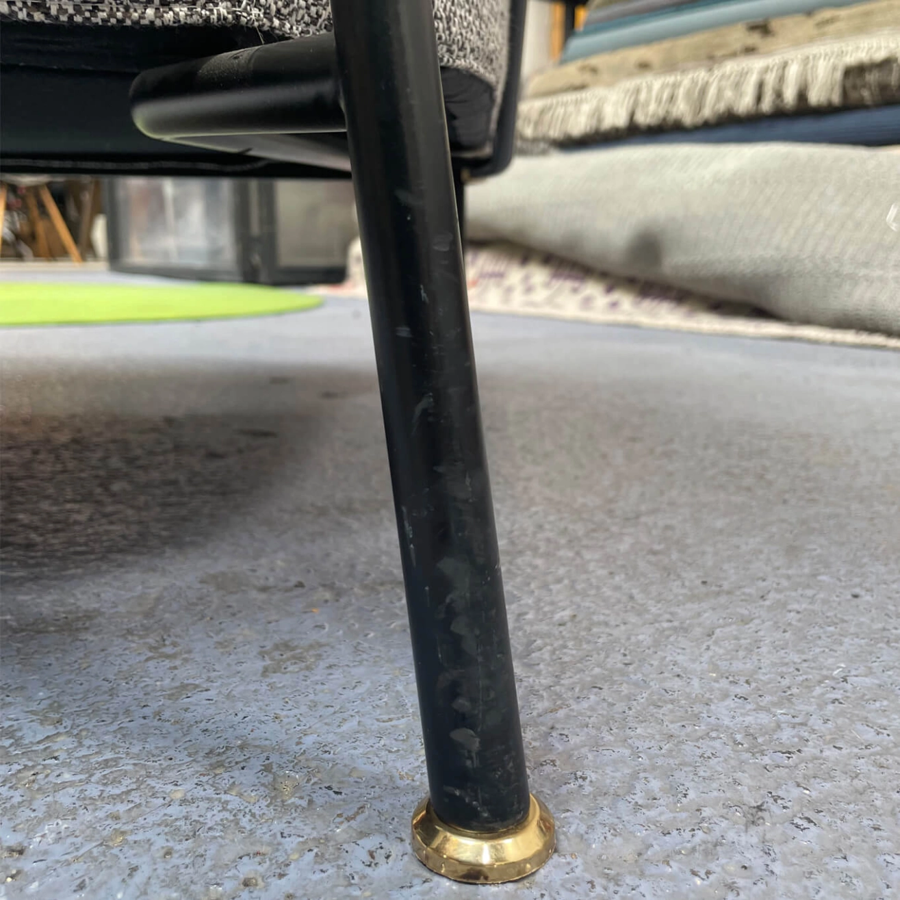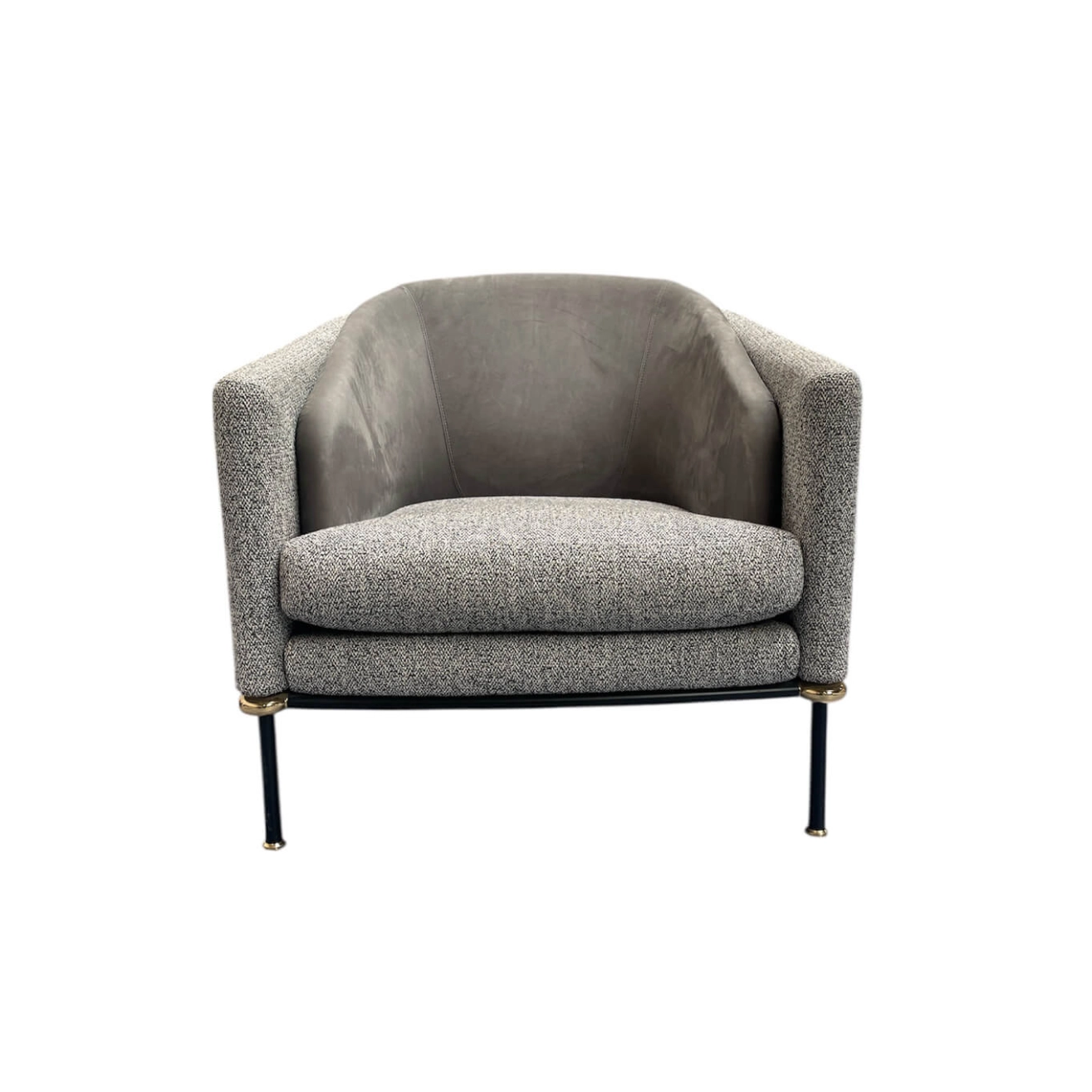 Upholstered in grey-black fabric and grey nubuck, with a black metal base