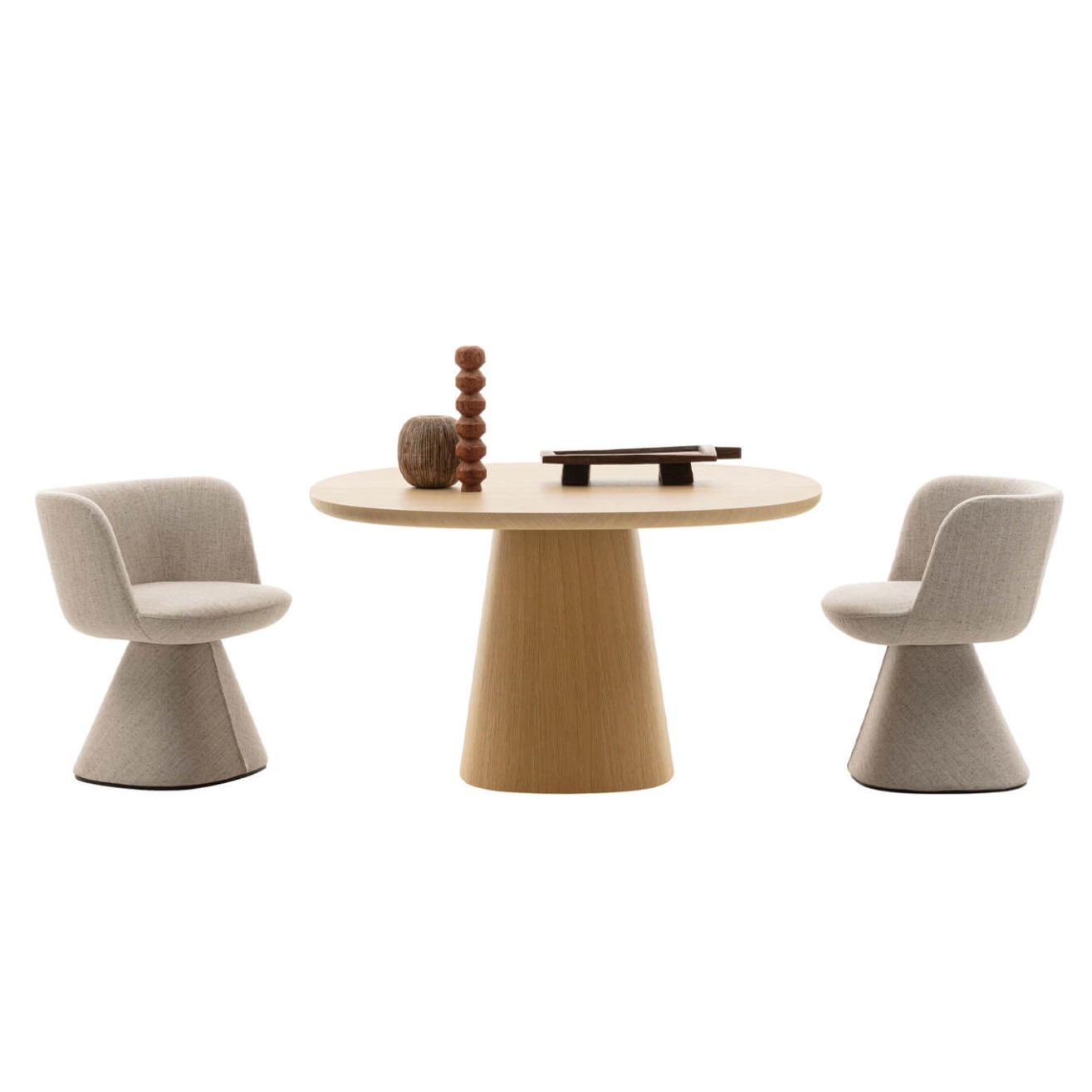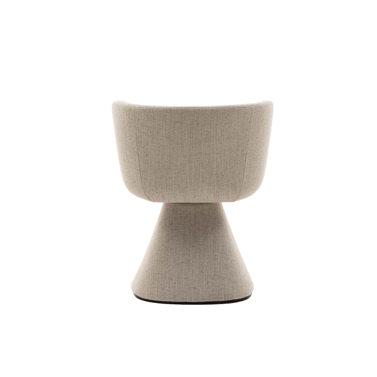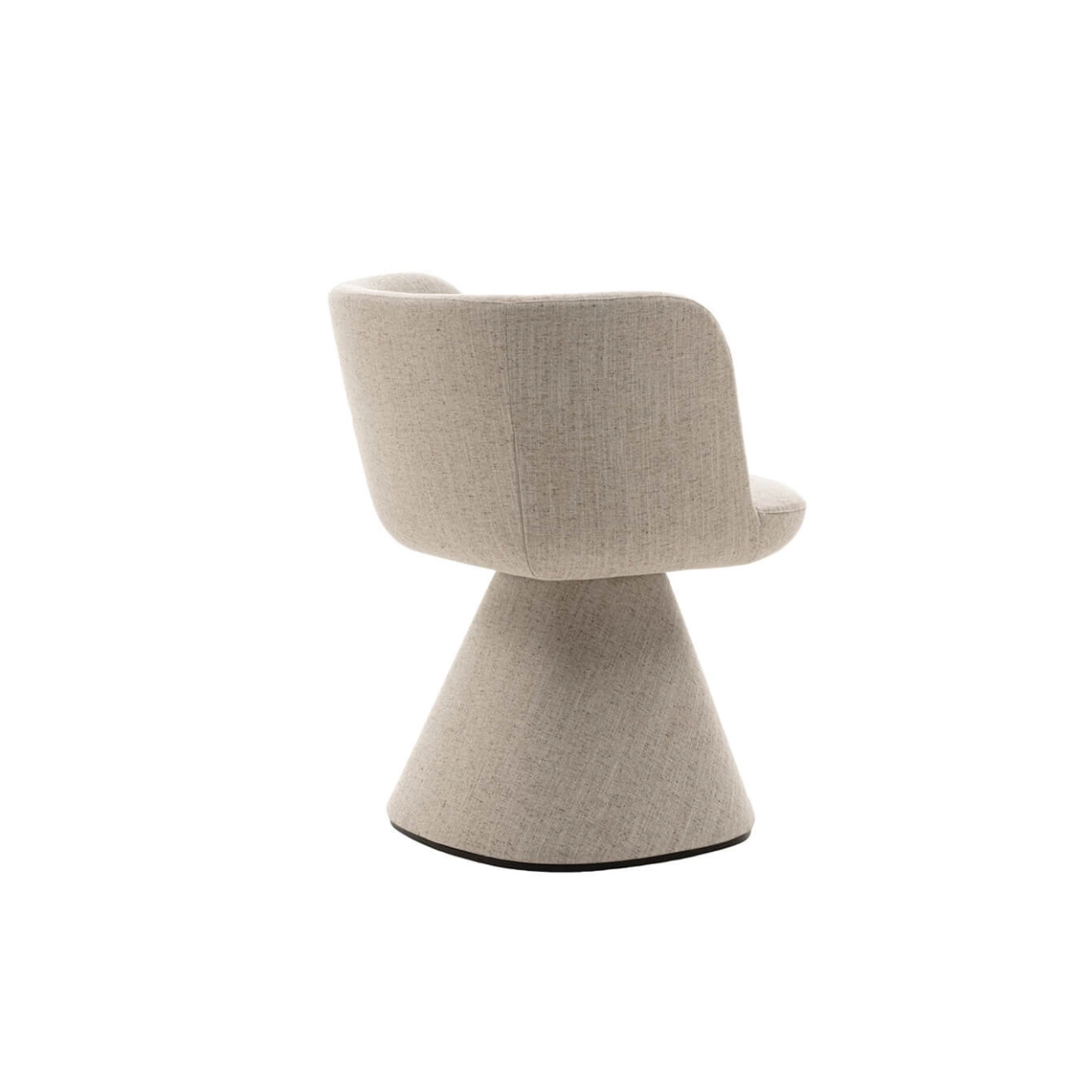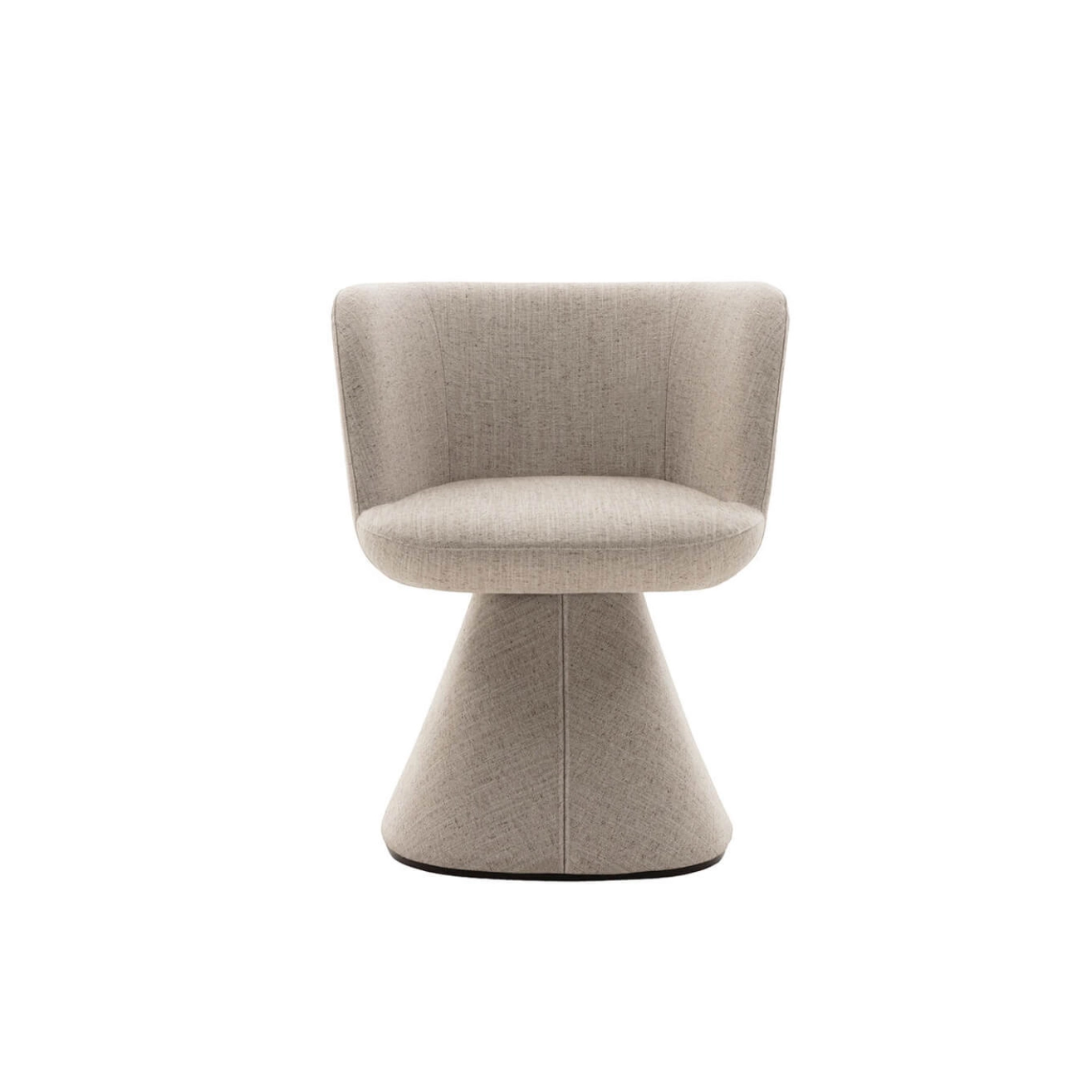 The Flair O' is a swivel dining chair with an elegant and modern design, created by Monica Armani in 2021 for the brand B&B Italia. A true domestic throne, this chair harmonizes perfectly with the Allure O' table, initiating a subtle dialogue between the two pieces starting from their base. Both pieces rest on a truncated pyramid with rounded edges, blending charm and elegance seamlessly. The base gently widens towards the back as it approaches the floor, a subtle yet crucial detail that enhances stability without compromising the harmony of the design. The padded seat ensures optimal comfort, while the pronounced tilt of the backrest and its enveloping shape allow for relaxation while maintaining an elegant posture, ideal for interacting with guests around the table. Additionally, the chair is equipped with a swiveling mechanism with automatic repositioning, adding a practical dimension to its refined aesthetics. The fabric upholstery dresses the Flair O' like a custom-tailored suit, enveloping the chair from the base to the seat for a flawless finish.