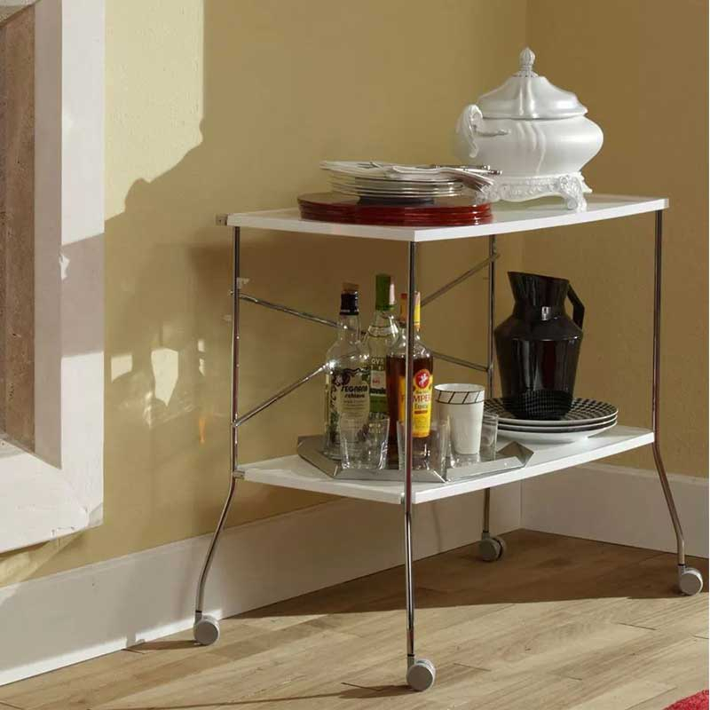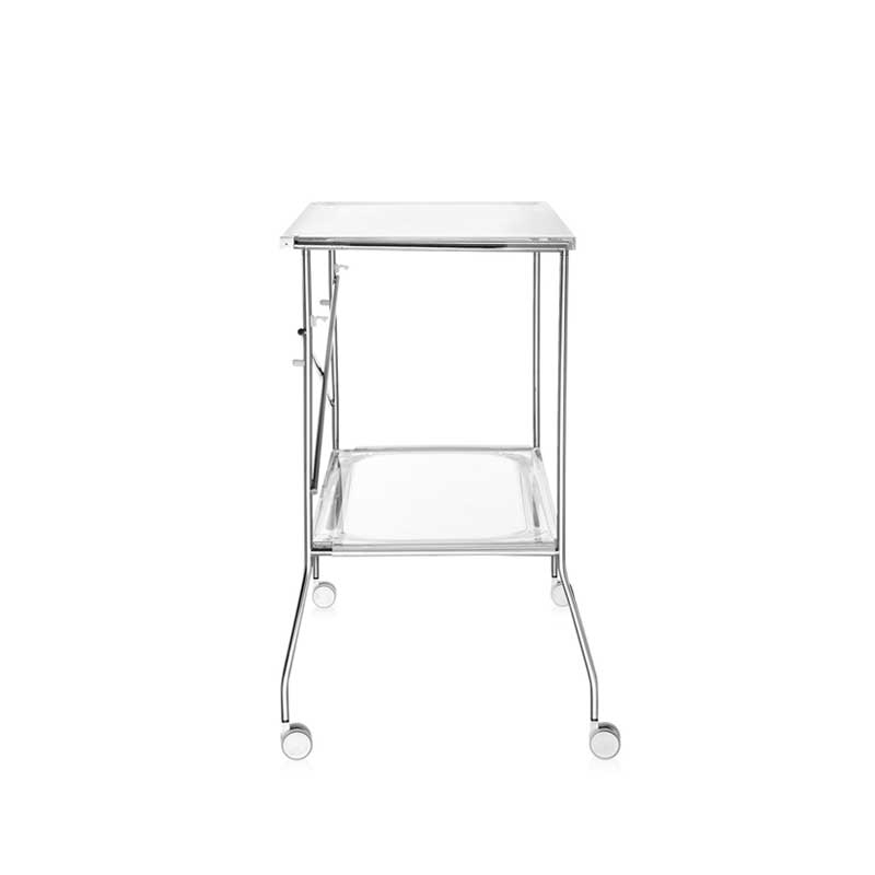 Designed for Kartell by Antonio Citterio, Flip is a folding trolley that combines a metal frame with clear, black, or white plastic tops. With folding tops that can be folded independently of each other (top or bottom only), the Flip trolley successfully pairs functionality with aesthetics. The wheels make it very easy to move, and it can be used either as a trolley (ideal for drinks and buffets) or as a coffee table, making it an ideal addition in front of a sofa. Flip can also be folded: when closed, it takes up very little space and is extremely easy to store.