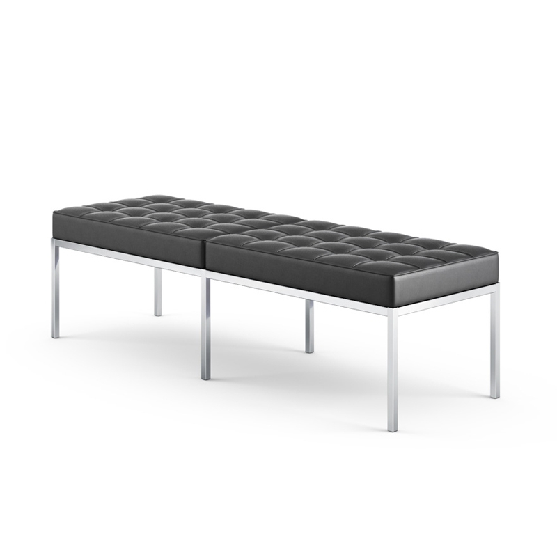 Designed by Florence Knoll in 1954, this bench is featured in the collection that bears her name. It works perfectly both in public and residential spaces; in your living room or bedroom. The Knoll studio logo and creator's signature are engraved on the base of the structure. The legs are made of welded square-section steel with a polished chrome finish topped with a seat upholstered in leather squares. This bench exudes elegance and welcomes your guests to sit on it delicately.