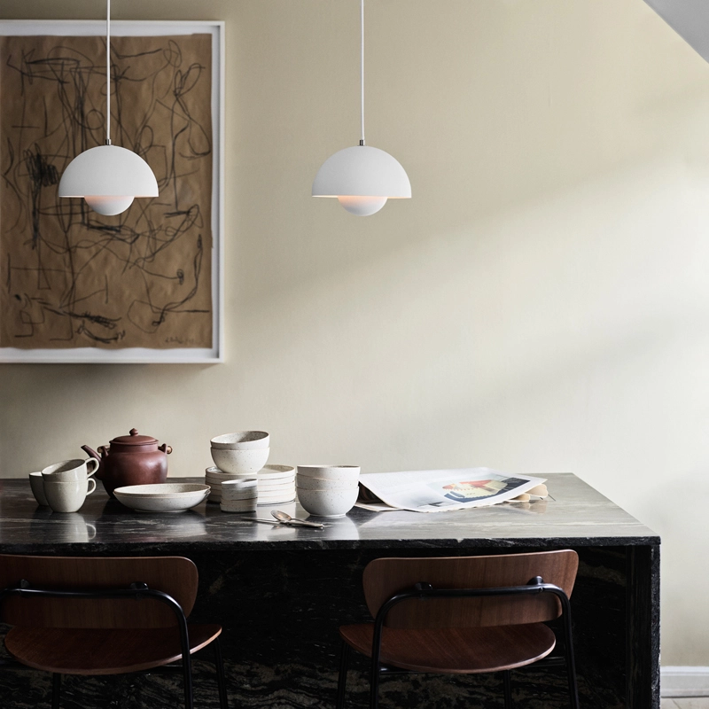A must-have design icon! This FlowerPot VP1 suspension lamp by &Tradition was designed in 1969 by Danish designer Verner Panton, one of the leading figures of 20th-century Scandinavian design. In 1968, the student riots in Paris, Rome and the United States overthrew the old, overly severe values and brought in the "Flower-Power" generation of peace, love and harmony. In the same year, Stanley Kubrick imagined the future, the year 2001, featuring in his film the Panton chair that had become a design classic and man was about to set foot on the moon. In the world of design, a colourful and fun pendant lamp was blooming in restaurants and exhibitions and was soon seen in homes, too. The FlowerPot VP1 lamp, with its two half-spheres facing each other, has become an iconic object of the 70's and its timeless, quality design edited by &Tradition has made it through the decades without getting a wrinkle! The strength of this FlowerPot VP1 suspensionfrom &Tradition lies in the interlocking interplay of the two metal domes that make it up. The round, elemental and playful shapes of this FlowerPot VP1 suspensionfrom &Tradition, are highlighted by a host of cheerful colours. With its wide choice of colours, the collection FlowerPot invites itself into the kitchen with the pendant model, on a bedside table or in the living room, in its table lamp version.