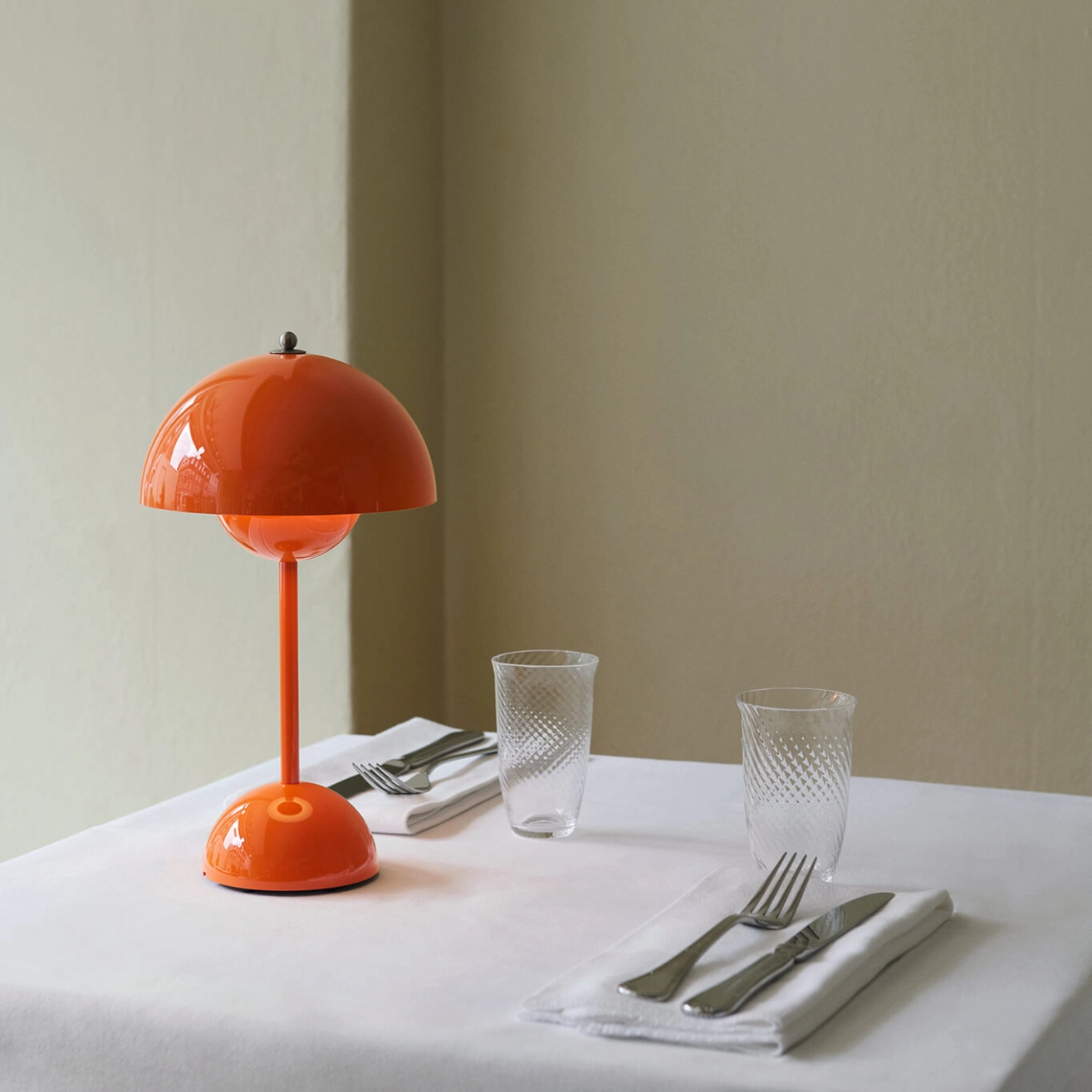 In 1968, the student riots in Paris, Rome and the United States overthrew the old, overly severe values and brought in the "Flower-Power" generation of peace, love and harmony. In the same year, Stanley Kubrick imagined the future, the year 2001, featuring in his film the Panton chair that had become a design classic and man was about to set foot on the moon. In the world of design, a colourful and fun pendant lamp was blooming in restaurants and exhibitions and was soon seen in homes, too. The FlowerPot lamp, with its two half spheres facing each other, features a timeless, high-quality design, edited by & Tradition. With a wide choice of colours, the FlowerPot VP9 table lamp is very practical thanks to its battery operation. With the cable removed, it can easily be moved around, finding the perfect spot in both homes and communal spaces.