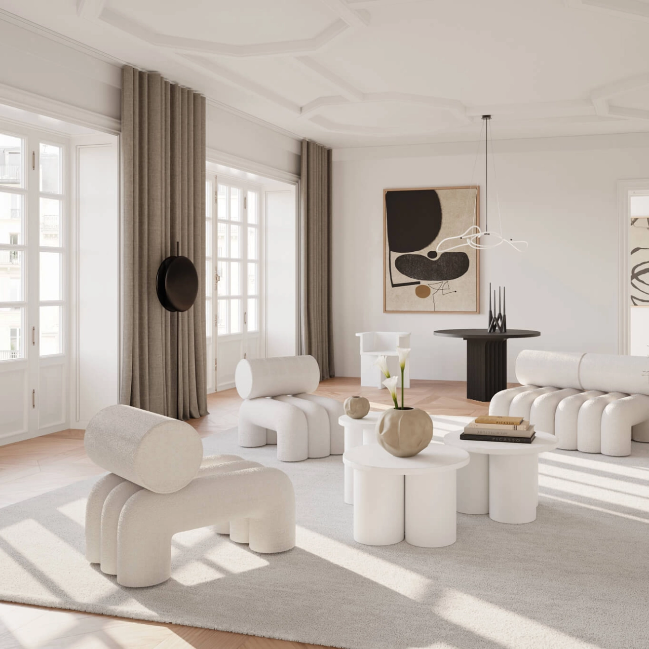 The Foku armchair by 101 Copenhagen, designed by Kristian Sofus Hansen and Tommy Hyldahl stands out with its sculptural design and contemporary aesthetic, blending bold geometric shapes with softened curves. With its generous, enveloping silhouette, Foku brings a strong presence to any interior while offering exceptional seating comfort. Its refined form makes it a statement piece, capable of becoming the focal point of a living room, lounge area, or elegantly designed office. Designed with particular attention to ergonomics and materials, the Foku armchair combines a robust structure with meticulous finishes, ensuring durability and quality. Its deep seat and curved backrest create a natural sense of support, inviting relaxation. Thanks to its design that is both minimalist and expressive, Foku integrates easily into modern interiors as well as more eclectic environments, adding a touch of sophistication and character.