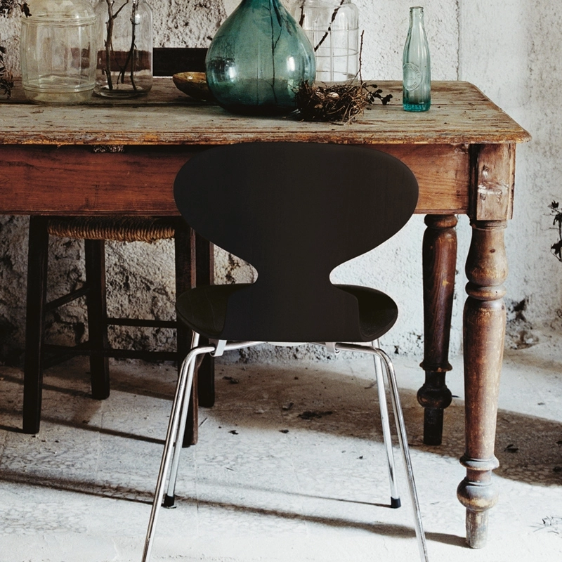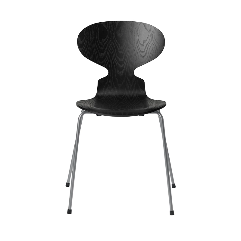 Arne Jacobsen's Fourmi chair is an icon that looks a bit like the shape of a fourmi with its head raised. Arne Jacobsen originally designed the Fourmi chairs for the canteen of Novo Nordic, a Danish pharmaceutical company, in 1952. Today the Ant chair is one of the dominant icons in the Fritz Hansen collection. Although the shapes are minimalist, the Fourmi is an extremely comfortable chair. It is a stackable chair made of oak wood and mounted on a four-legged base in satin-finish stainless steel tube.The shell is made of die-cast veneer — seven layers of inner veneer and two layers of outer veneer at the bow and stern of the shell. The inner veneer is made of beech.