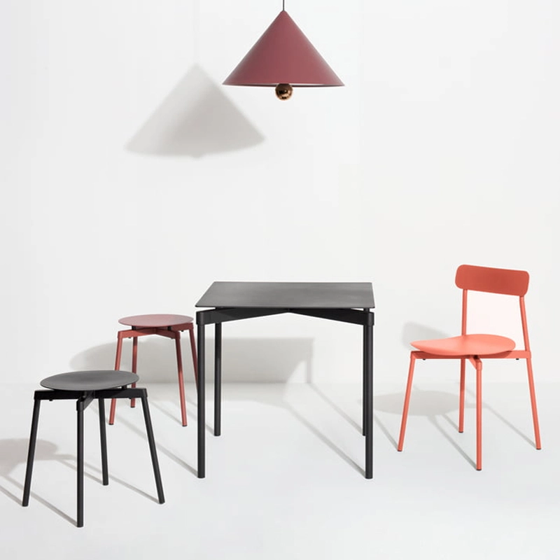 Edited by Petite Friture, Fromme is a collection of metal furniture designed for outdoor use, distinguished by its pure lines and uniqueness. Perfect for 2 people, the square table Fromme has been designed for both indoor and outdoor use. It can be decorated with chairs and stools from the same collection. The Fromme square table is made of aluminum, a durable material. It is 100% recyclable without degradation of its properties. Its recycling requires little energy. Moreover, its recycling process is one of the best organized. The manufacture of the collection required the creation of special molds. The legs of the table are extruded tubes that ensure lightness and solidity to the Frommetable.