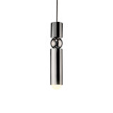 Created and produced by the talented Lee Broom, Fulcrum is a fine and elegant pendant lamp. Like a minimalist sculpture, it is composed of two cylinders joined by a central sphere. The visible bulb symmetrically imitates the silhouette of the sphere. Available in chrome, brass and matt black, Fulcrum is also available as a 5-piece chandelier.