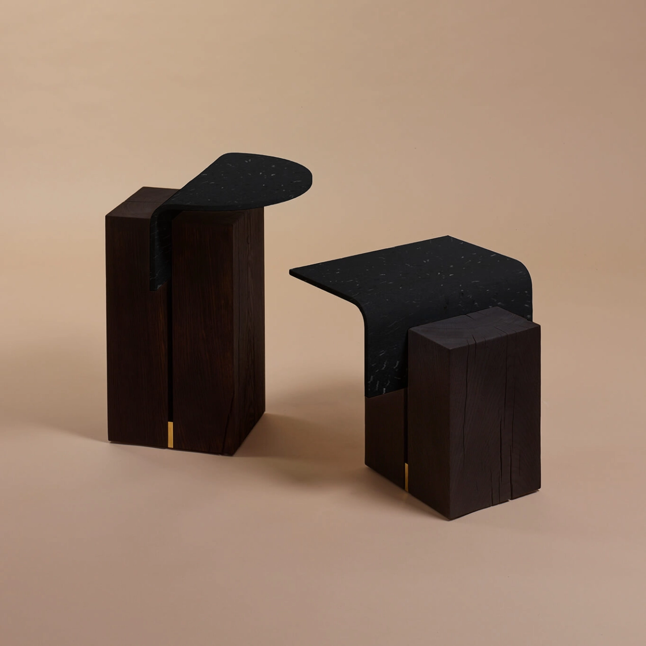 Walnut-stained recycled oak, recycled plastic, brass