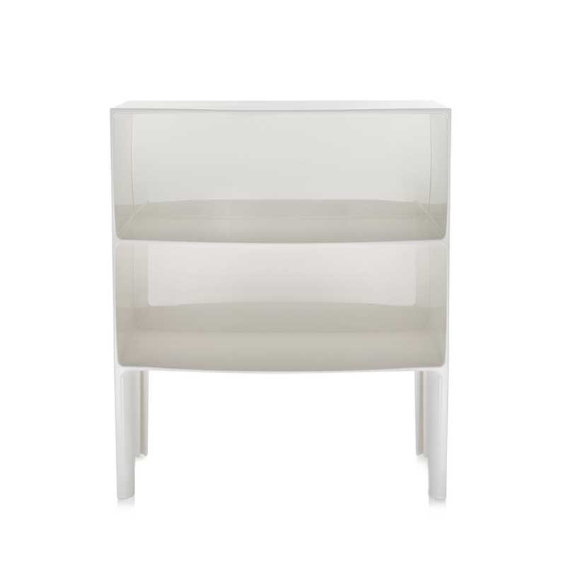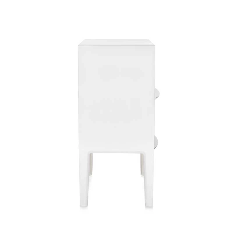 Produced by Kartell and designed by Philippe Starck, the Ghost Buster chest of drawers evokes the shapes of classic furniture, while its transparency and the plastic material used to produce it give it a very contemporary touch. The succession of angles, curves, straight lines, and sinuosity on the surface create an intriguing and eye-catching array of perspectives and reflections. Consisting of three open shelves at the front and supported by four double-sided legs, the Ghost Buster storage unit is the largest plastic monobloc ever produced to date in the furniture world. It is available in black, white, clear, and smoke.
