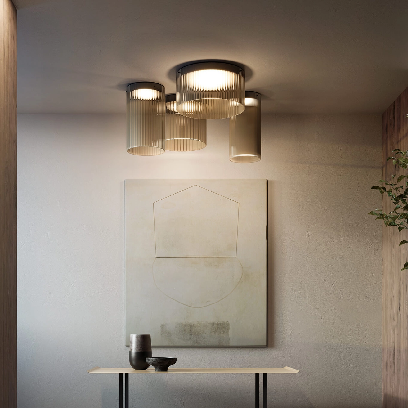 The ceiling lamp Giass by the brand KDLN, designed by Sebastian Herkner, draws inspiration from blown and sandblasted glass to create a luminaire with continuous, shimmering reflections, recalling the warm glow of traditional bar glassware. Available in four sizes — ø 25 cm, ø 30 cm, ø 40 cm and ø 50 cm — each version offers distinct height and luminous power, allowing great compositional freedom. The glass diffuser coupled with a coated metal structure and satin polycarbonate screen ensures a uniform distribution of light while minimizing glare. Giass works beautifully as a standalone ceiling light or in clusters to form artistic, graphic lighting installations. Its design perfectly balances elegance and practicality, making it suitable for refined contemporary interiors.
