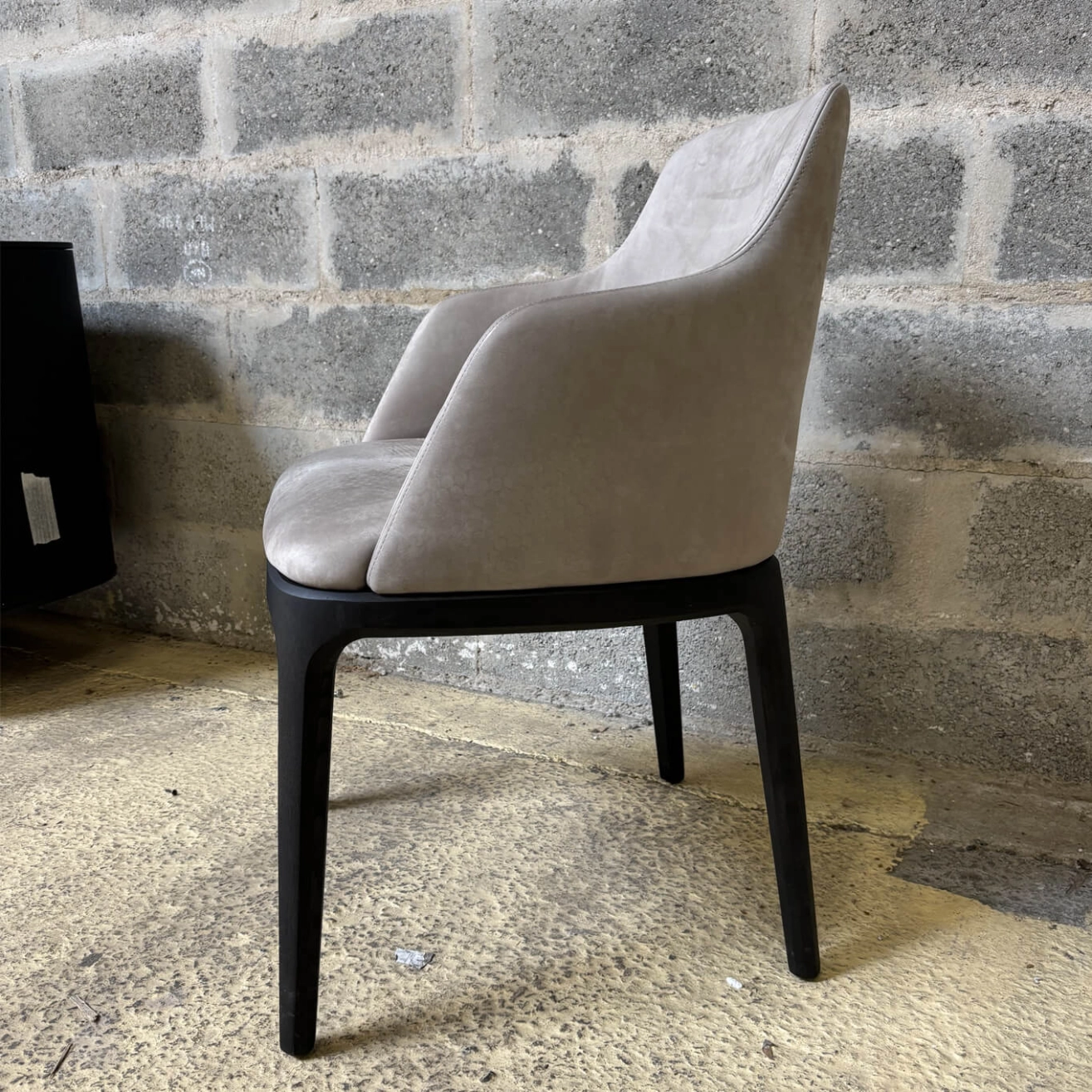 La chaise d'occasion Grace de Poliform, dessinée par Emmanuel Gallina, incarne l’élégance discrète et la sophistication contemporaine. Ses lignes épurées s’inspirent de la tradition artisanale, mais s’expriment avec une modernité parfaitement maîtrisée. La structure en bois massif, travaillée avec une grande finesse, met en valeur la silhouette élancée de la chaise, tandis que l’assise et le dossier enveloppants assurent un confort remarquable grâce à une mousse de haute qualité. Proposée en tissu ou en cuir, Grace s’adapte facilement à différents univers, de la salle à manger moderne aux intérieurs plus raffinés. Malgré son allure intemporelle et sa conception soignée, le modèle présenté montre des traces d’usure sur le piètement, un signe d’utilisation qui n’altère en rien la stabilité ni le charme d’ensemble de la pièce. Élégante, confortable et polyvalente, la chaise d'occasion Grace de Poliform reste une chaise emblématique du design contemporain italien.