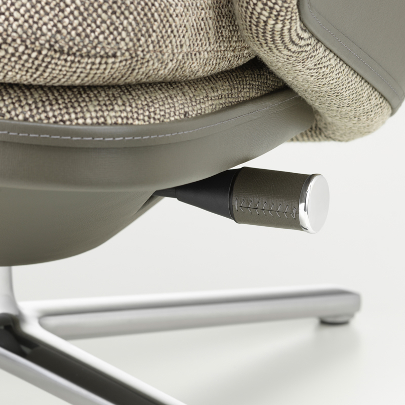 The Grand Relax from Vitra is a luxurious recliner that combines exceptional comfort with compact dimensions and a sleek, classic aesthetic. The exceptional seating experience offered by this chair is the result of the harmonious interaction of various components and its design as an upholstered piece of furniture. As the user sits, they sink slowly into the cushions, while a concealed integrated mechanism absorbs their weight and slides the chair into a reclined position. The seat and back move independently, in a simultaneous motion. A control button is used to adjust the mechanism's resistance and the back can be locked in any position. Mounted on an elegant four-star aluminium base, the Grand Relax armchair swivels through 360°. A matching Ottoman is available as an optional footrest or additional seat. In this version, the entire inner part of the seat is made of fabric, while the back, the lower structure of the seat and the Ottoman and the back resistance control button are covered with Leather Forte.