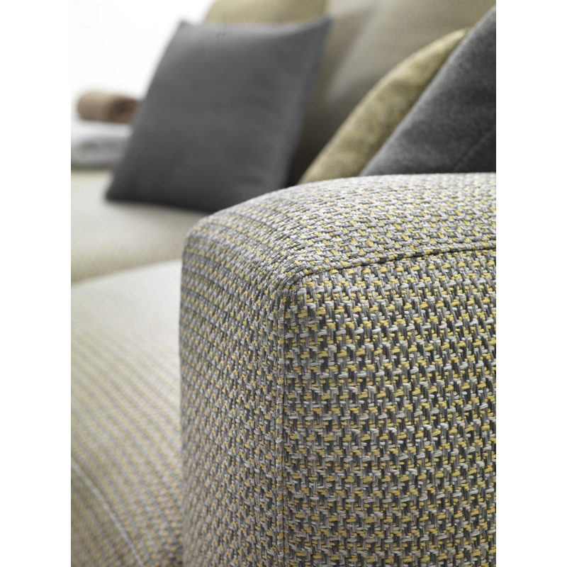 Flexform features an aggregation of supple geometric volumes that are totally devoid of sharp edges, resting on a platform of compact laminate, a latest-generation material particularly suited to outdoor use. The traditional upholstered armrest can be replaced by an iroko wood element, which acts as a mini table and has a useful compartment for storing objects. The Grandemare Outdoor
