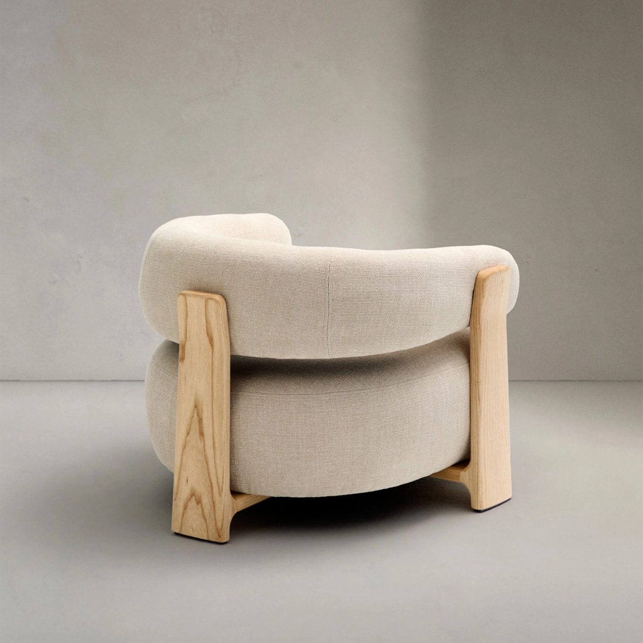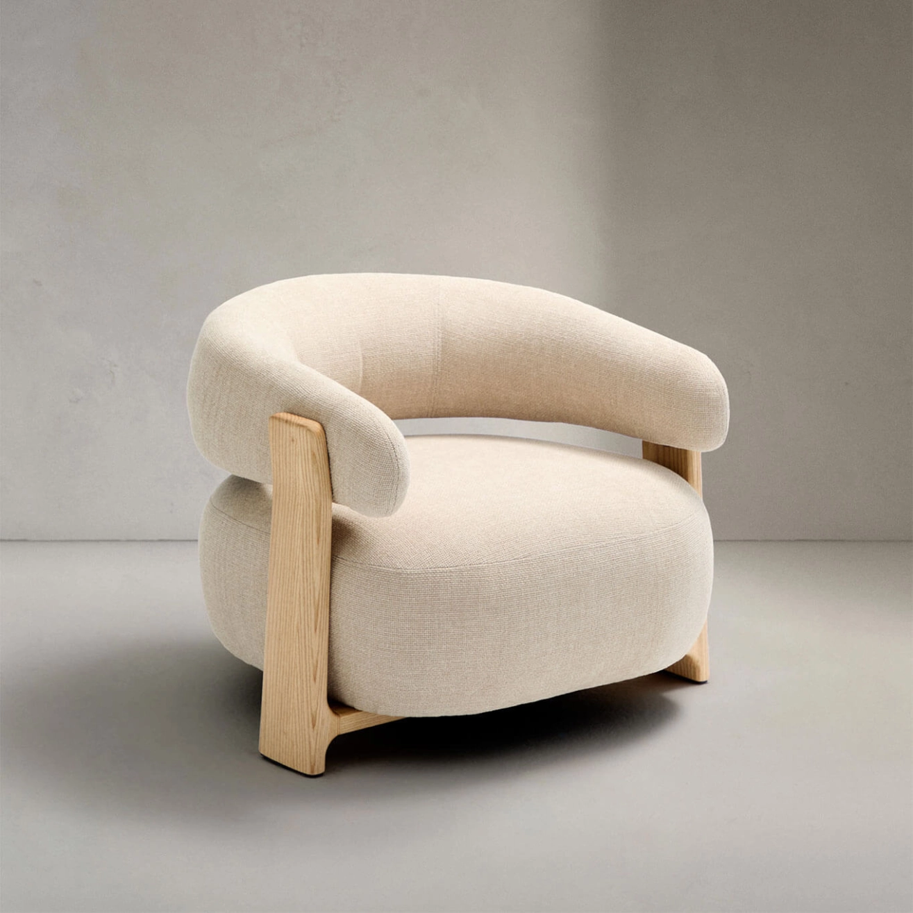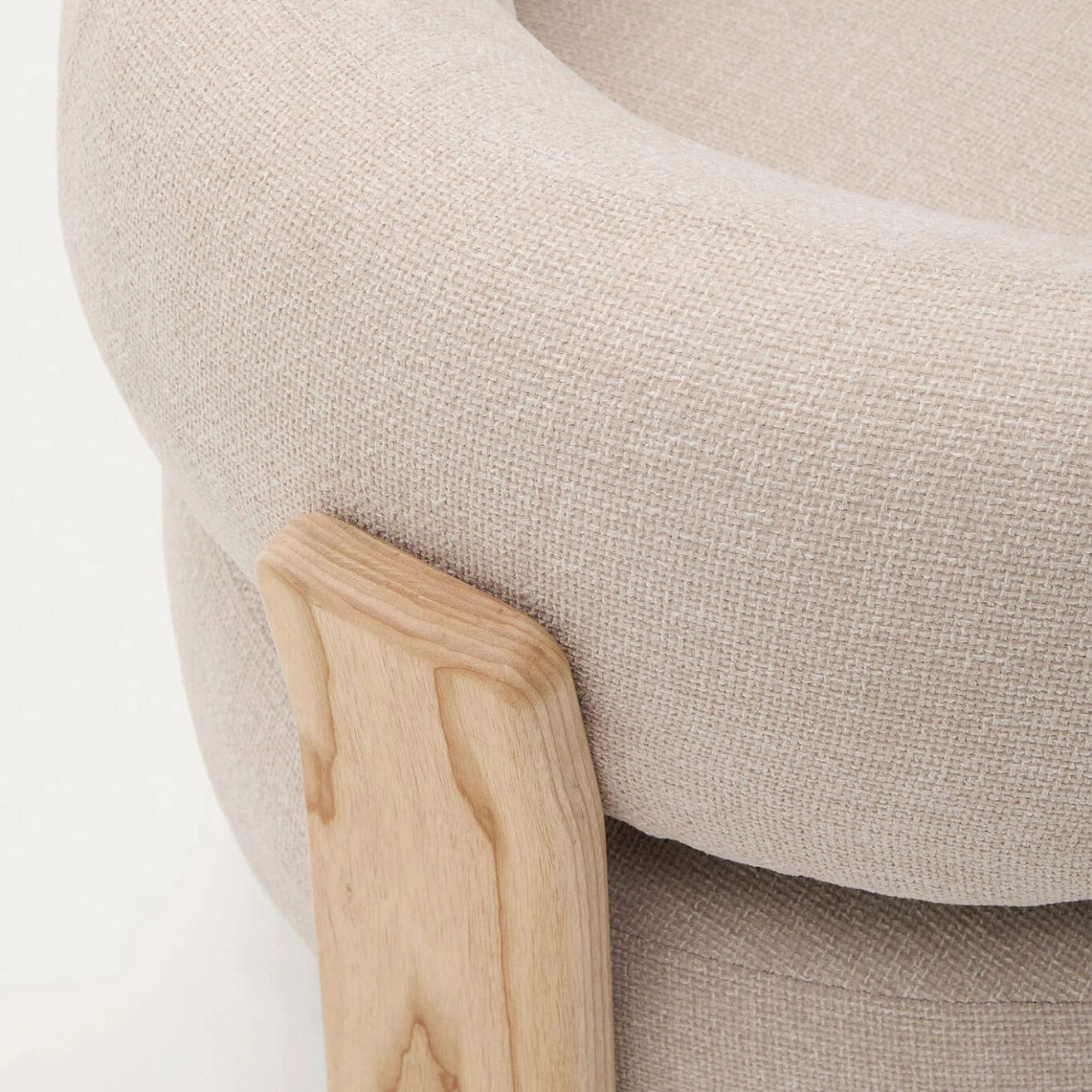 timeless elegance, inspired by 1970s Scandinavian design, featuring generous, enveloping, and sculptural forms. The wide seat and curved backrest are upholstered in a thick chenille fabric, soft and warm to the touch, offered in a subtly nuanced tone. This fabric is made from