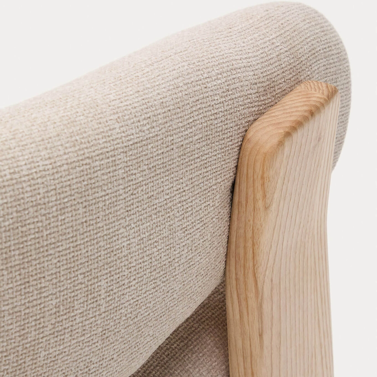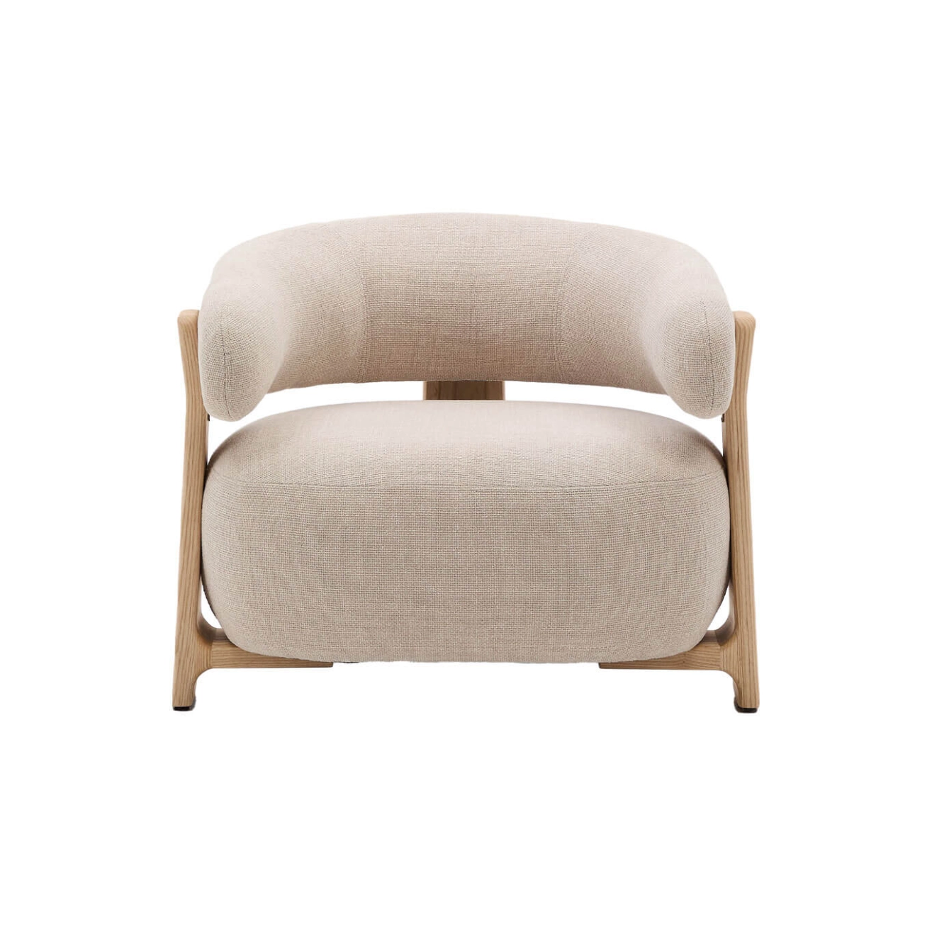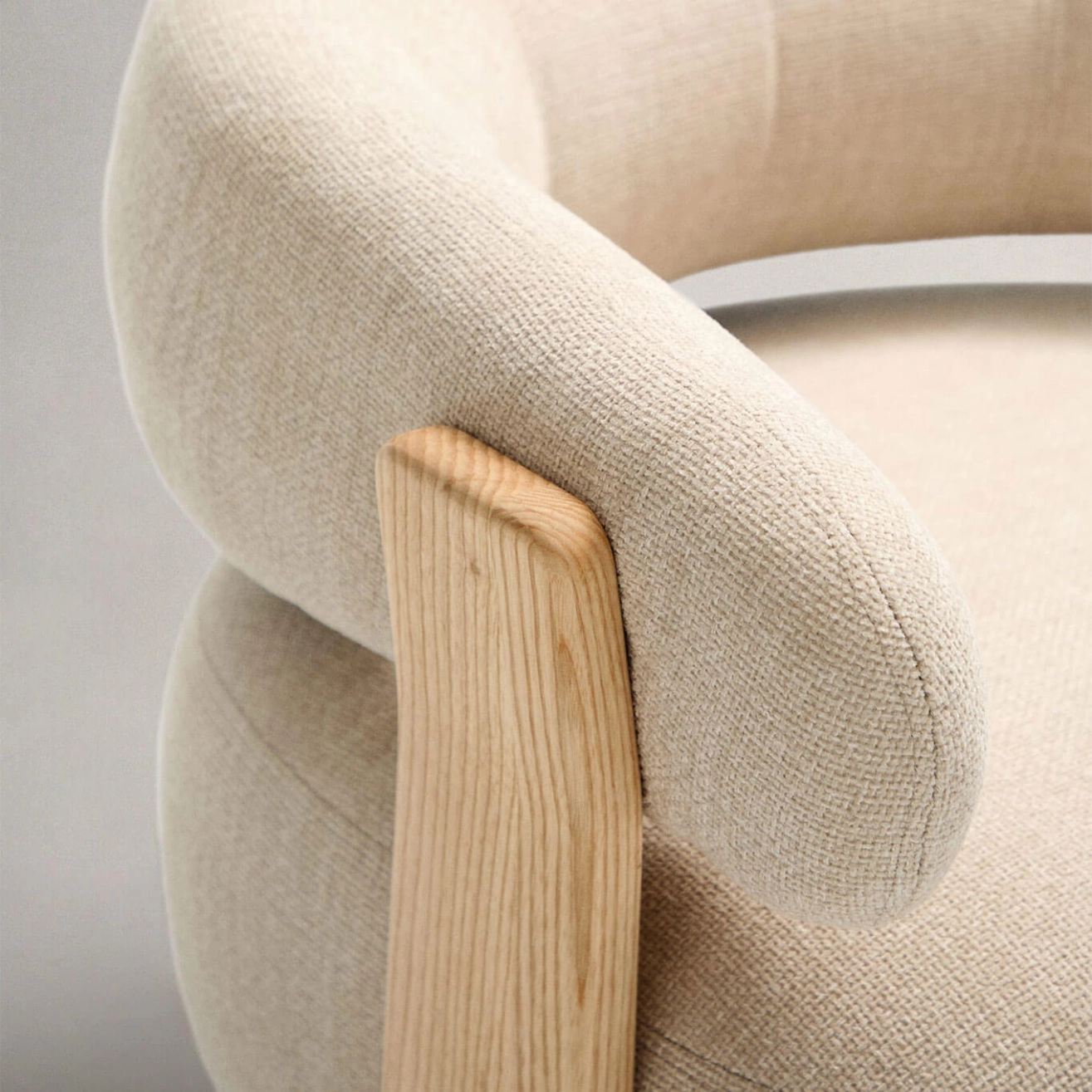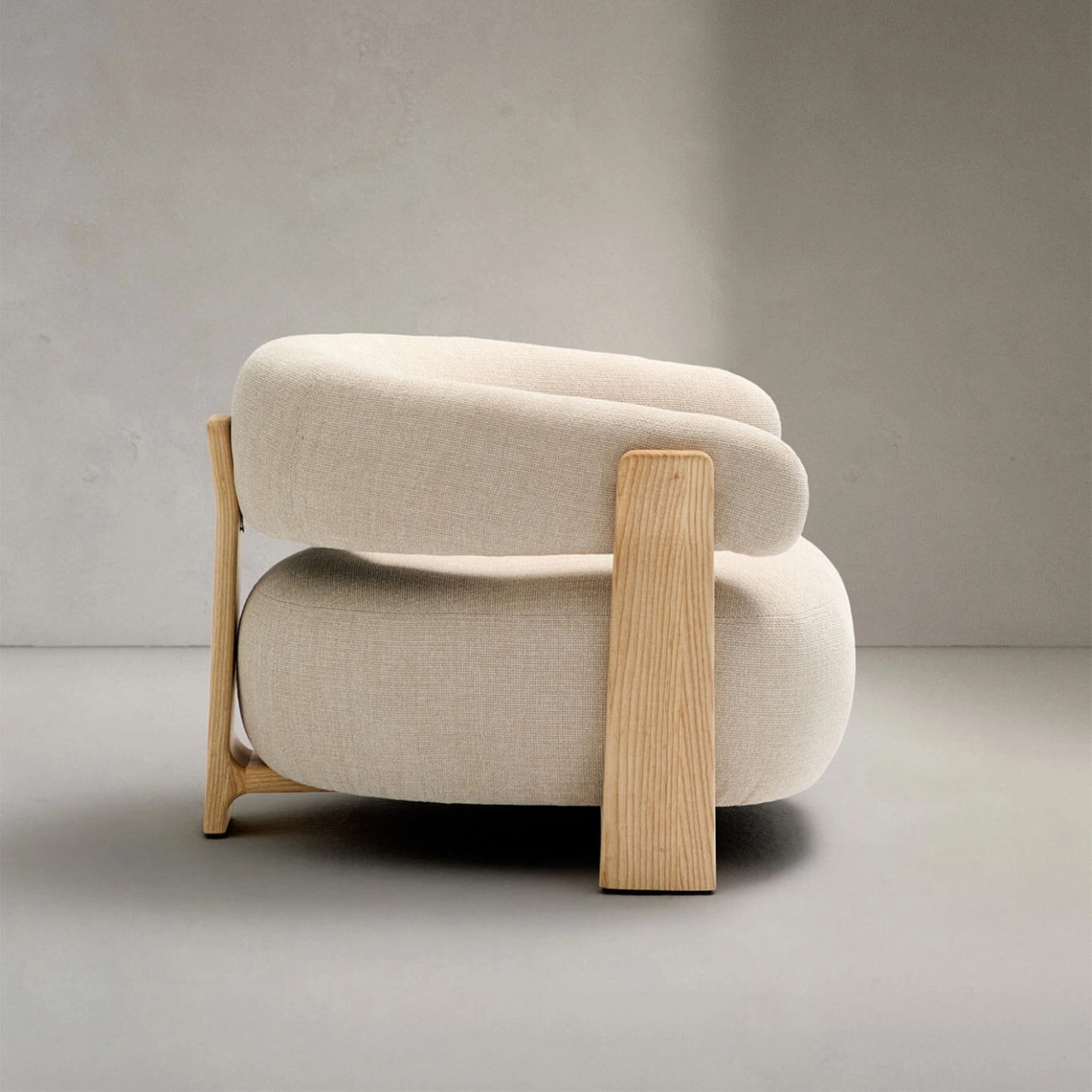 timeless elegance, inspired by 1970s Scandinavian design, featuring generous, enveloping, and sculptural forms. The wide seat and curved backrest are upholstered in a thick chenille fabric, soft and warm to the touch, offered in a subtly nuanced tone. This fabric is made from