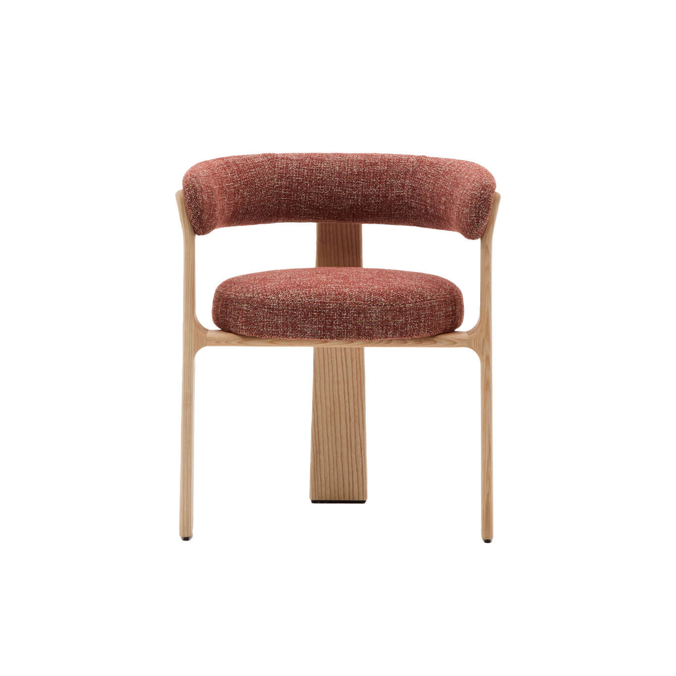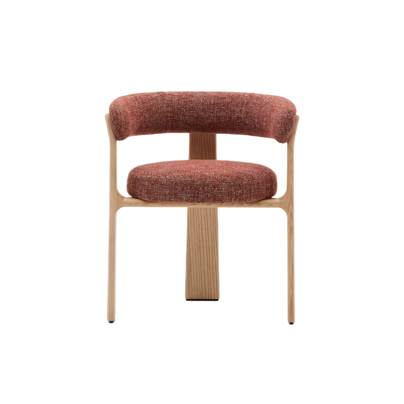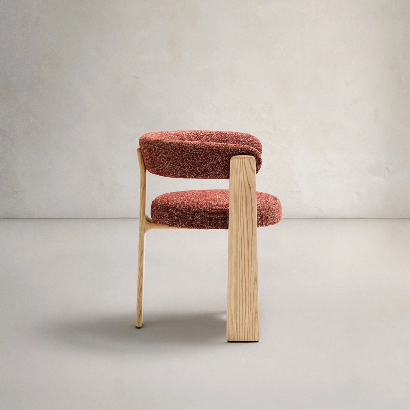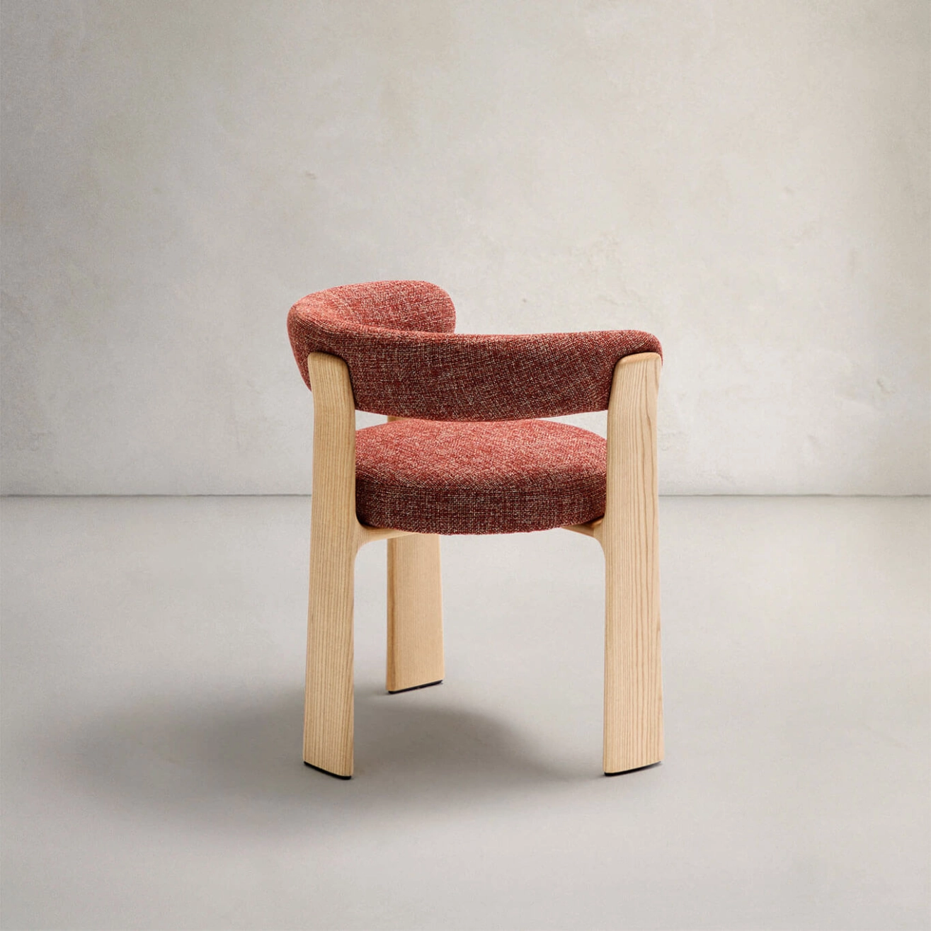 timeless elegance, inspired by 1970s Scandinavian design, with generous, enveloping shapes and a boldly modern presence. Its seat and backrest are upholstered in a thick chenille fabric, soft and warm to the touch, in a subtly nuanced two-tone terracotta. This fabric is made from
