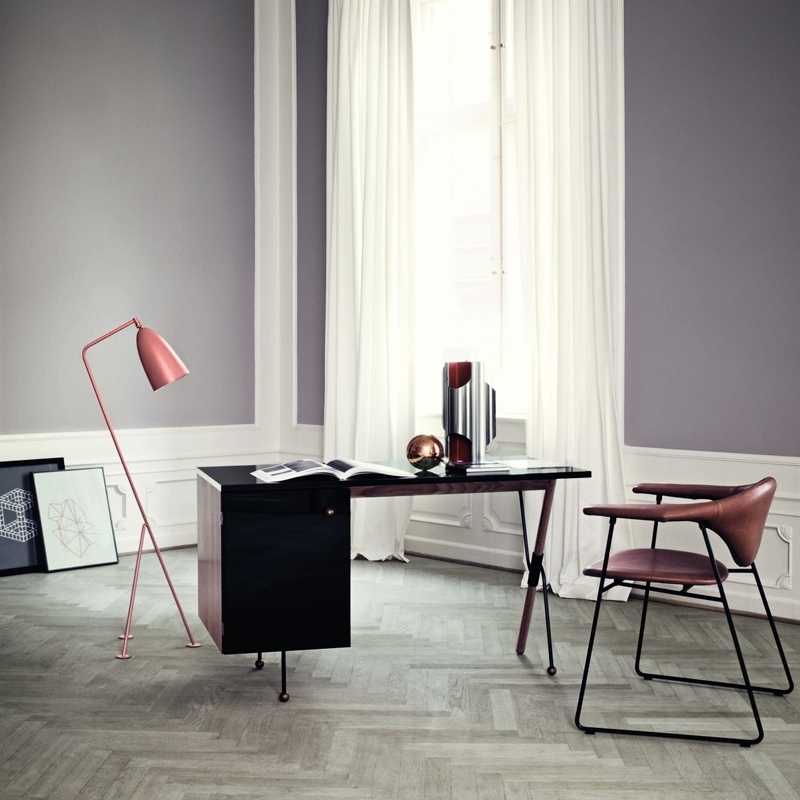 Gubi is distinguished by its backward sloping base and the shape of its shade, both inspired by the silhouette of the grasshopper. An iconic object from the mid-20th century, the