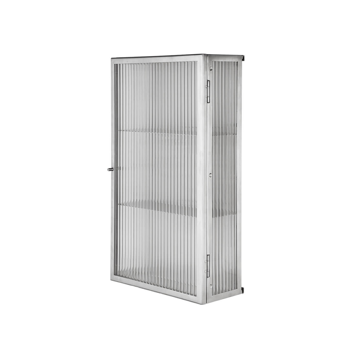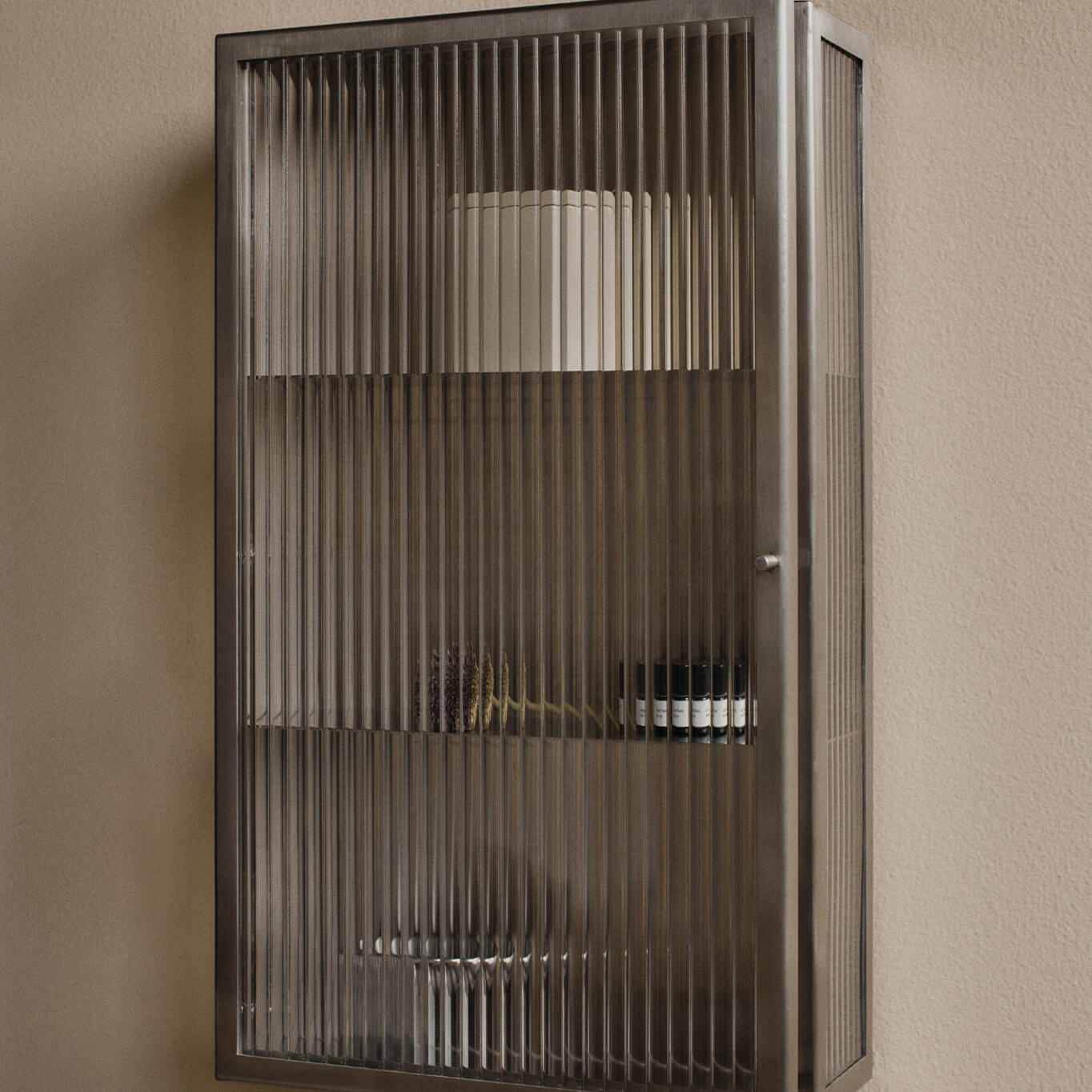 Edited by Ferm Living, the Haze Wall Cabinet is an elegant, graphic wall storage piece that plays with contrasting materials and textures. Its slim metal frame surrounds a ribbed glass door, subtly revealing the contents while maintaining discretion. Perfect for storing everyday small items, Haze fits effortlessly in any room: glasses and cups in the kitchen, beauty products in the bathroom, or accessories in the entryway. Also available in an armored glass version.
