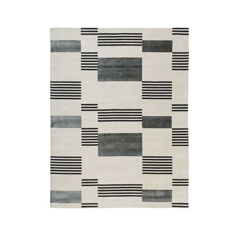 carpets are distinguished by their pattern, which alternates touches of colour and black lines on a light background. The result is a visually-striking, light carpet that stands out without imposing itself. Made of Himalayan wool and silk,