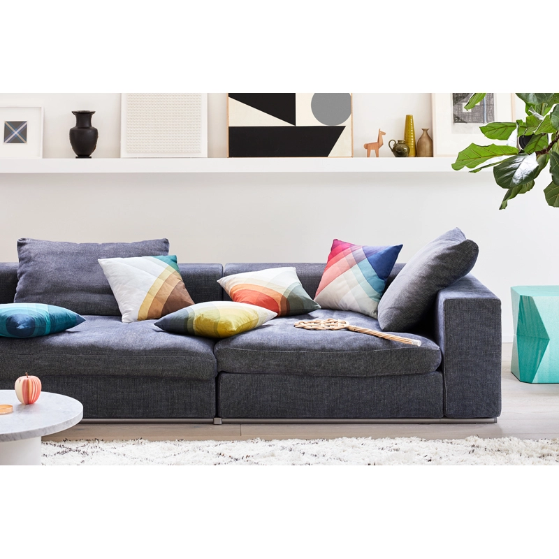 Created by Raw-Edges for the furnishings and fittings of an entire floor of the VitraHaus on the Vitra Campus, the Herringbone collection grew out of the studio's interest in the dip-dyeing technique. The Herringbone cushions exude a cheerful atmosphere thanks to the use of light colours and captivating patterns, which are characterised by a very geometric look despite being handcrafted. Crossed and overlapping stripes of varying colour intensity were achieved by multiple immersions in different coloured dyes, the end result being the exact pattern printed on the Herringbone cushions. Published by Vitra, these cushions bring a touch of vitamin to any interior.