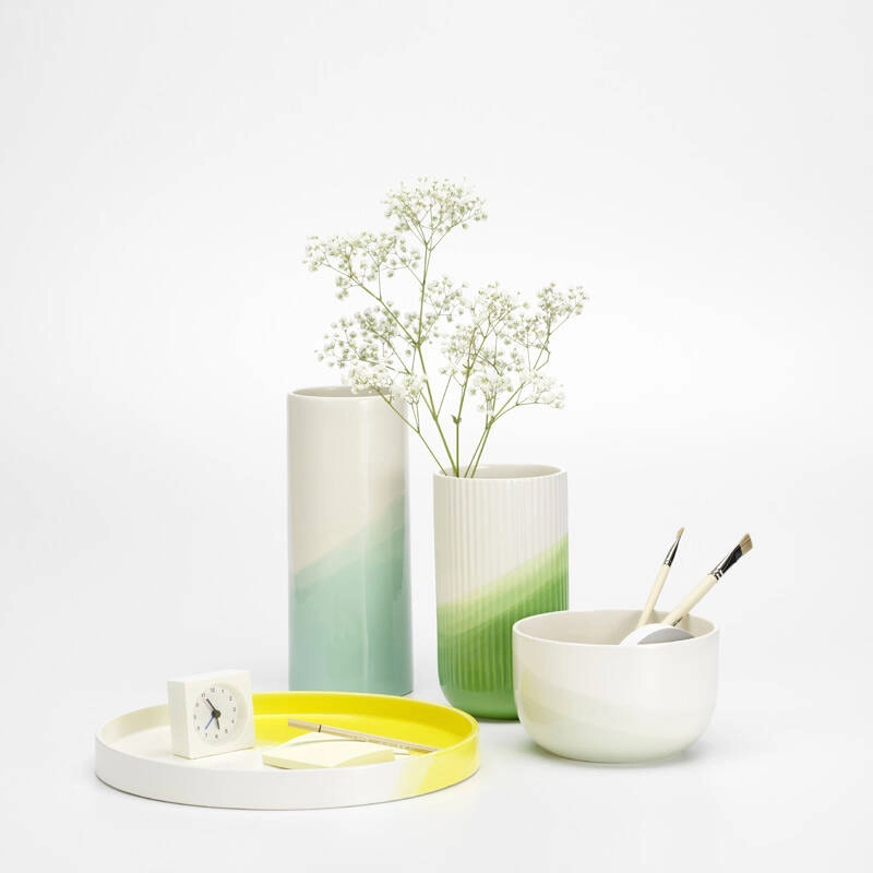Created by Raw-Edges for the furnishings and fittings of an entire floor of the VitraHaus on the Vitra Campus, the Herringbone collection grew out of the studio's interest in the dip-dyeing technique. The Herringbone Vessels are created by repeatedly dipping ceramic bowls and vases in a coloured glaze. This process produces a pattern obeying an intrinsic logic, determined by the angle of immersion as well as the shape and weight of the object. The transformation of different materials and shapes by soaking in a dye bath exerts an almost magical fascination on design duo Shay Alkalay and Yael Mer, leading to the decision to further refine the design of the Herringbone collection for mass production at Vitra. Entirely handmade, each bowl, vase and tray in the Herringbone Vessels collection is a unique object.