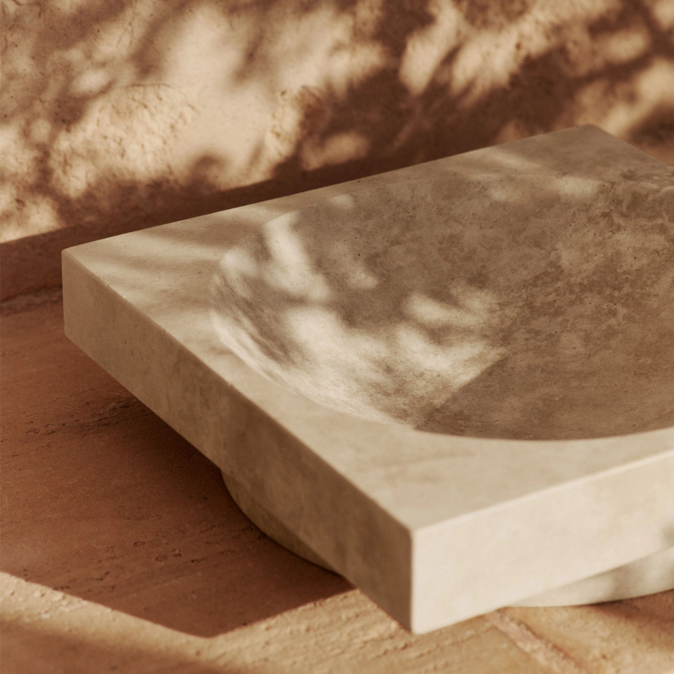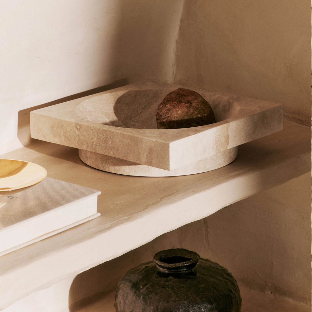 The Hew Series is a collection of solid travertine pieces that combine sculptural simplicity with the natural elegance of stone. Crafted from solid travertine blocks, the Hew low centerpiece features a square shape with a rounded concave center. Its monolithic presence and minimalist design make it a striking centerpiece that highlights the sophistication of travertine.
