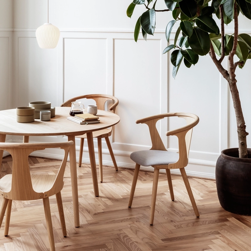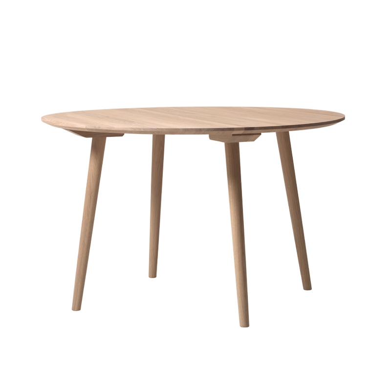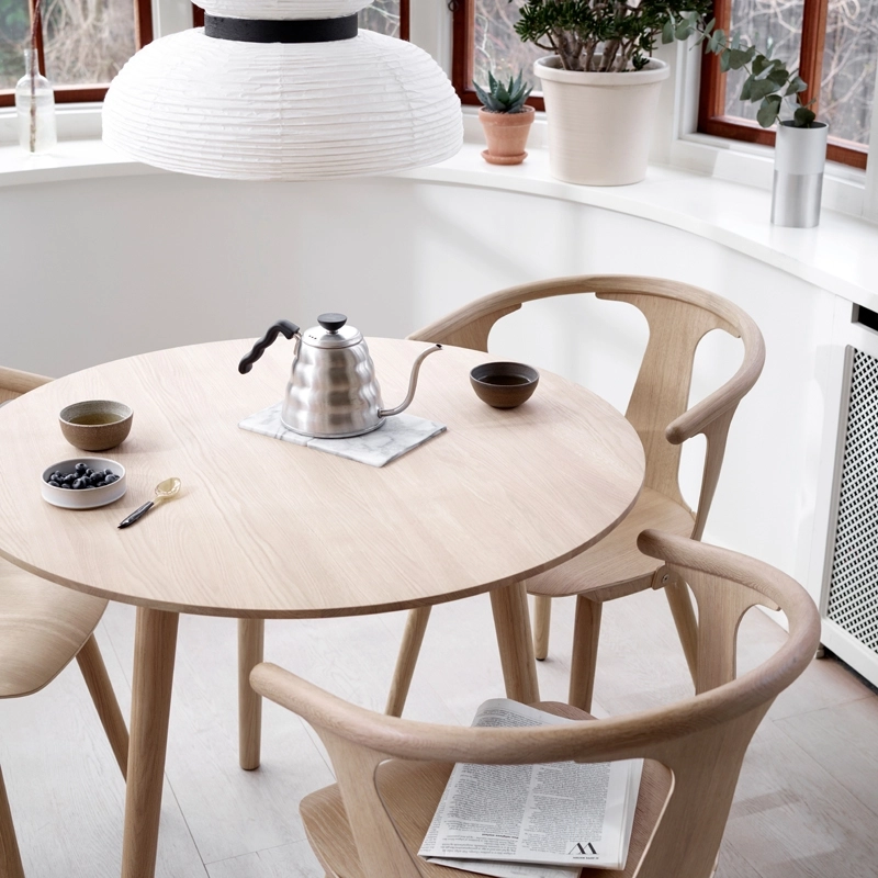 Edited by And Tradition, the In Between table was designed to accompany the chair of the same name. Designed by Sami Kallio, this dining table reinterprets certain aspects of the chair in terms of its form and the techniques employed. The solid oak used is a hardy and reliable wood in the Scandinavian tradition. Like the chair, the In Between table is a showcase for the designer's expertise and hand-crafted woodwork. Producing the chair requires modern industrial processes and manual interventions, creating a harmony between innovation and tradition. Thanks to its round shape and two available diameters, in Between by And Tradition blends easily into interiors and brings a dynamic touch to the room it's in.