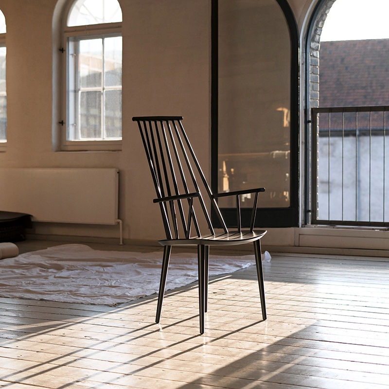 J110 chair is featured in Hay's reissued collection of Danish furniture classics originally designed for the Danish consumer cooperative society FDB. The initial idea that emerged in the 1940s was to create functional and democratic furniture, accessible to all. By using industrial production processes, and therefore reducing costs, FDB improved the availability of designer furniture for the general population, offering high quality design at relatively low prices. Designed by Poul M. Volther, the J110 armchair is made of beechwood and available in a natural or painted finish. J110 armchair perfectly represents vintage Scandinavian design with its pure, understated and retro lines. The designer opted for a backrest made of thin, wooden spindles, characteristic of the Windsor chair, to form an ethereal and graphic structure with a very comfortable seat. An armchair that adapts to all areas of your home. The seat is the same height as the other dining chairs, but thanks to its high backrest it bears a certain resemblance to a low armchair.