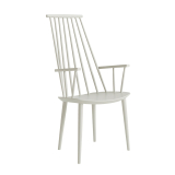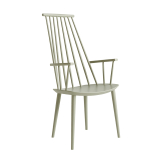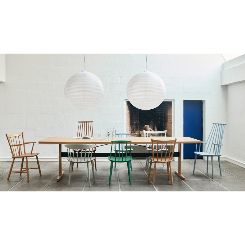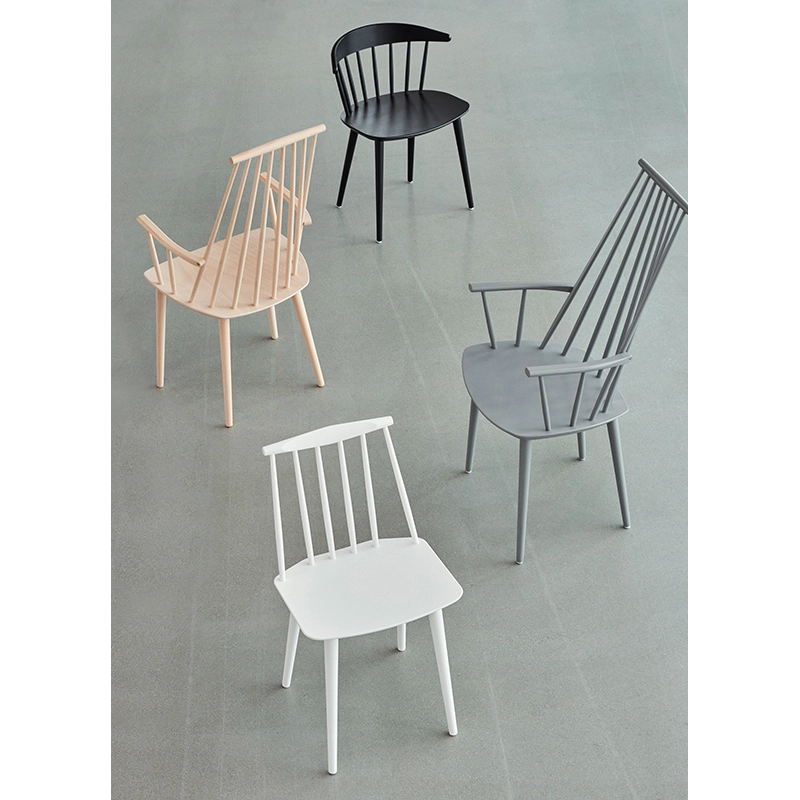 J110 chair is featured in Hay's reissued collection of Danish furniture classics originally designed for the Danish consumer cooperative society FDB. The initial idea that emerged in the 1940s was to create functional and democratic furniture, accessible to all. By using industrial production processes, and therefore reducing costs, FDB improved the availability of designer furniture for the general population, offering high quality design at relatively low prices. Designed by Poul M. Volther, the J110 armchair is made of beechwood and available in a natural or painted finish. J110 armchair perfectly represents vintage Scandinavian design with its pure, understated and retro lines. The designer opted for a backrest made of thin, wooden spindles, characteristic of the Windsor chair, to form an ethereal and graphic structure with a very comfortable seat. An armchair that adapts to all areas of your home. The seat is the same height as the other dining chairs, but thanks to its high backrest it bears a certain resemblance to a low armchair.