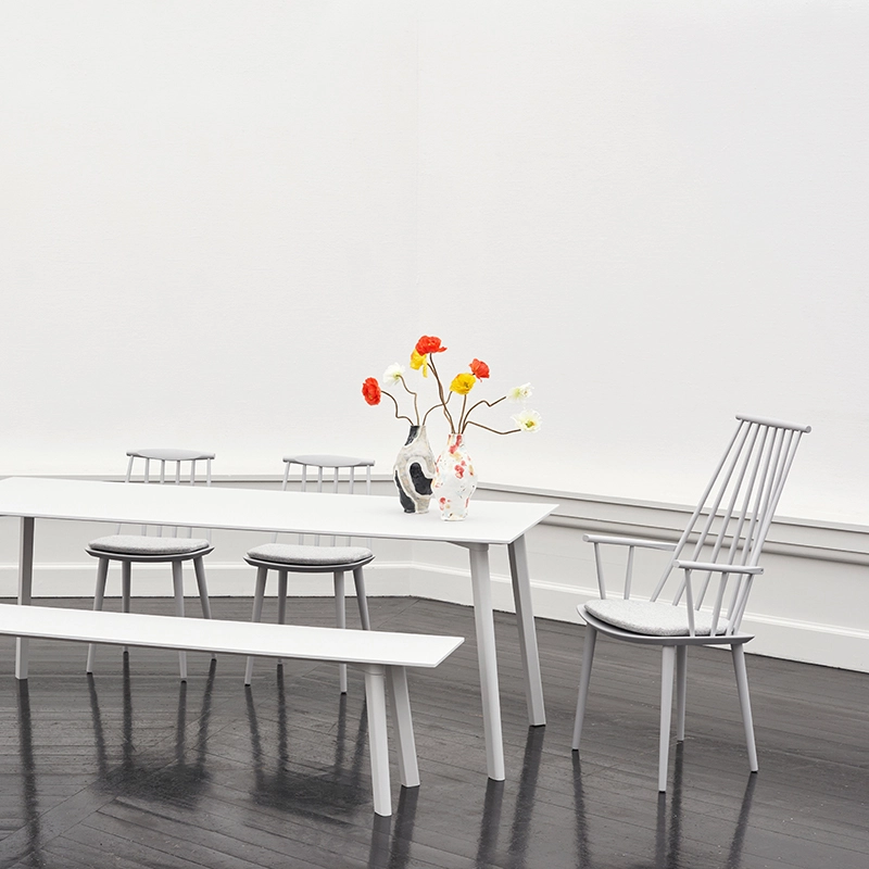 J110 chair is featured in Hay's reissued collection of Danish furniture classics originally designed for the Danish consumer cooperative society FDB. The initial idea that emerged in the 1940s was to create functional and democratic furniture, accessible to all. By using industrial production processes, and therefore reducing costs, FDB improved the availability of designer furniture for the general population, offering high quality design at relatively low prices. Designed by Poul M. Volther, the J110 armchair is made of beechwood and available in a natural or painted finish. J110 armchair perfectly represents vintage Scandinavian design with its pure, understated and retro lines. The designer opted for a backrest made of thin, wooden spindles, characteristic of the Windsor chair, to form an ethereal and graphic structure with a very comfortable seat. An armchair that adapts to all areas of your home. The seat is the same height as the other dining chairs, but thanks to its high backrest it bears a certain resemblance to a low armchair.