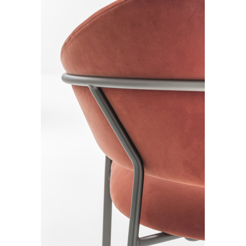 Pedrali offers a small, comfortable armchair with an upholstered curved seat and backrest covered in velvet. The whole is supported by a light steel structure that wraps the