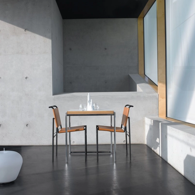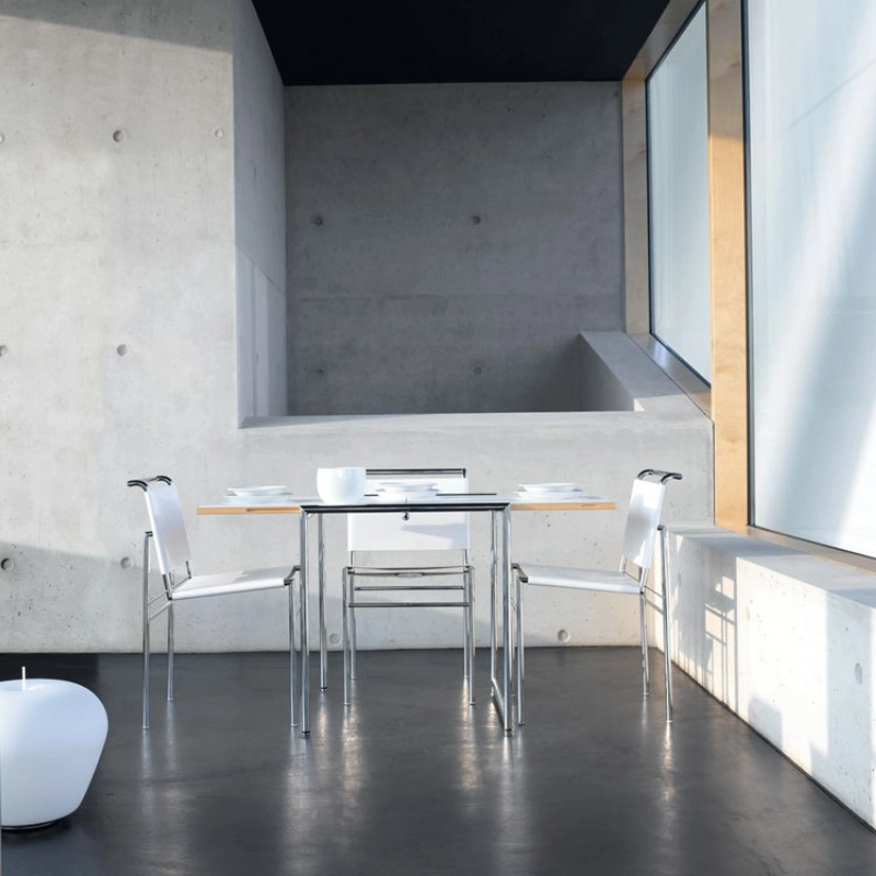 Eileen Gray created the Jean table in 1929 for Villa E1027, located on the French Riviera. Named after Gray's friend, the architect Jean Badovici, this folding table is made of a chrome-plated steel frame and a white laminated top with beech edges. Gray had several of these tables, produced by Classicon, installed in the villa, where they served as both small home office and dining table. Lightweight and stable even when unfolded, this design classic fits into any style of interior.