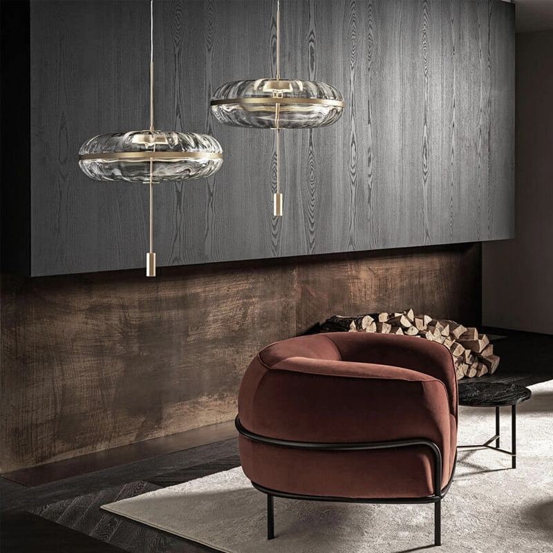 The Jolie suspension by Gallotti & Radice features two domed sections of Murano blown glass with satin brass detailing. The pendant comes with a 4-metre-long cable, so it can be installed anywhere, even on very high ceilings. Alone or in a composition of several elements, the Jolie suspension brings a touch of timeless elegance to your home. Jolie is also available in a wall-mounted version.
